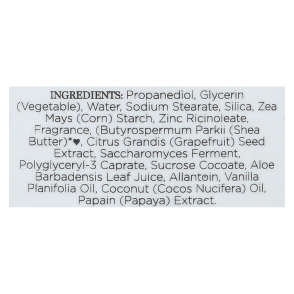 ingredients : propanediol;glycerin;vegetable;water;sodium stearate;silica;zea mays;corn;starch;zinc ricinoleate;fragrance;butyrospermum parkii;shea butter;●. Citrus grandis;grapefruit;seed extract;saccharomyces ferment;polyglyceryl-3 caprate;sucrose cocoate;aloe barbadensis leaf juice;allantoin;vanilla planifolia oil;coconut;cocos nucifera;oil;papain;papaya;extract. *certified organic ingredient ●fair trade ingredient natural may vary in color and consistency