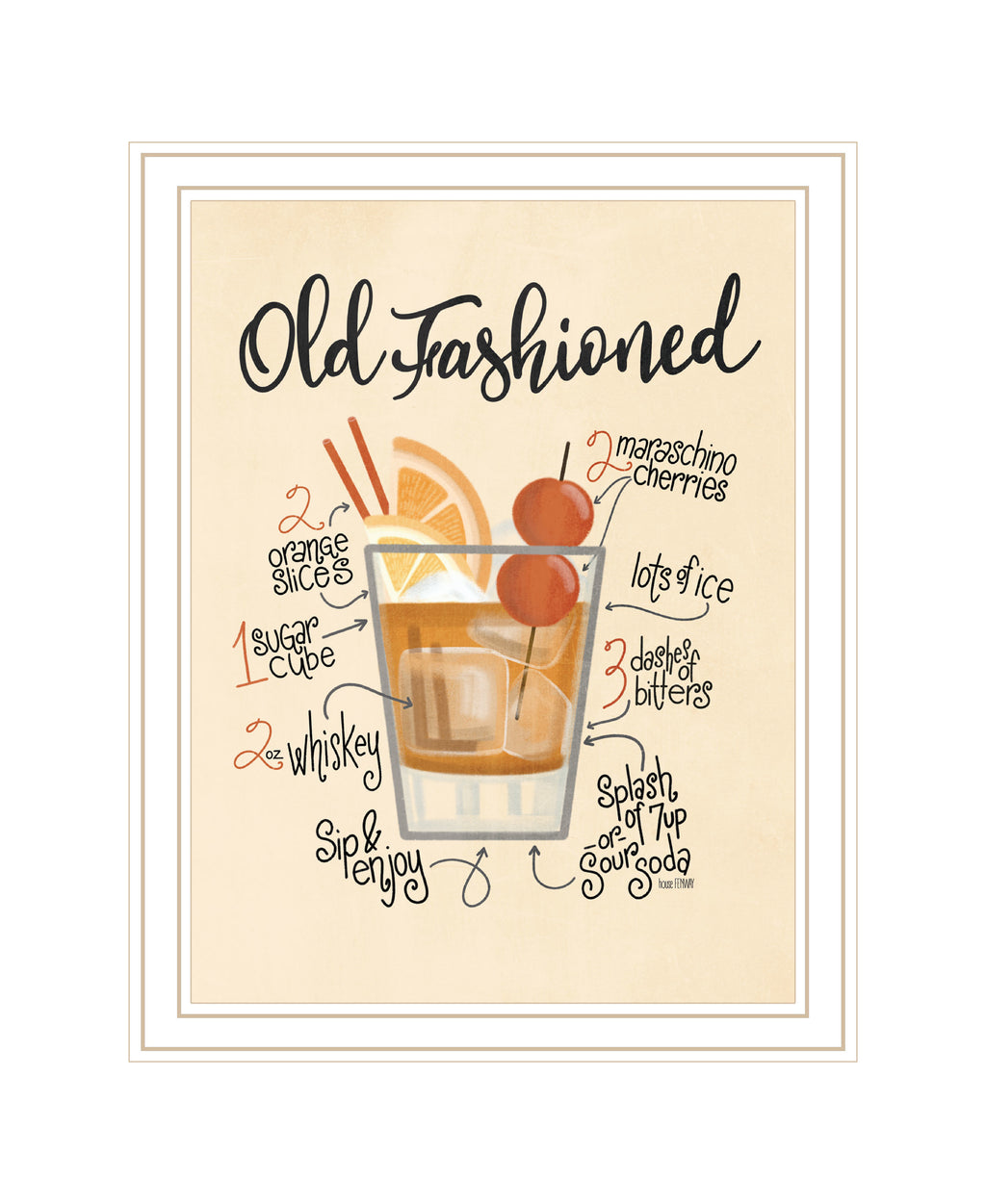 "Old Fashioned" is by Artisan House Fenway. This 14"X18" decorative white framed wall art. This image features the perfect instructions on how to make a Old Fashioned drink. Our products are proudly made by skilled American workers. The surface of our framed art is textured with a fade resistant coating, so no glass is necessary. A vegetable-based glue is used in the production of our products, and our frames are crafted from 100% recycled material. In keeping with our environmentally friendly approach towards manufacturing. Arrives ready to hang.•Print has fade resistant surface texture, no glass is necessary•Woman Owned Business (WBE)•Arrives ready to hang, no additional hardware needed on item•individually hand crafted by skilled American workers•Cleaning Instructions: Clean with Soft Dry Cloth Only•Made in U.S.A.•Artwork by American Artist