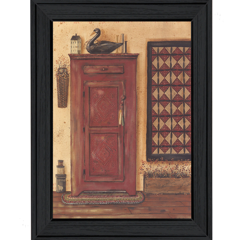 "Old Red Pie Safe" is a 15" x 21" black framed art print by Artist Pam Britton, this artwork features a rustic image of country decor and the "Old Red Pie Safe". This totally American Made wall decor item features an decorative black frame. The print has a protective, archival finish (glass is not needed) and arrives ready to hang.•Women Owned (WBE)•Textured Artwork with a 'rolled on' acid free acrylic coating to create a canvas painting effect. No glass is necessary.•UV protectant coating protects artwork from fading.•Arrives Ready to Hang