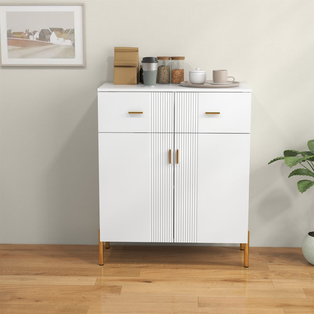 Introducing our Modern Decorative Sideboard, a stylish and functional piece that enhances any home decor. This sideboard features a contemporary design with raised vertical stripe decorations on the surface, complemented by a platinum finish. The gold drawer handles and metal feet add a modern touch to the overall aesthetic. It includes two drawers and a large storage cabinet with adjustable shelves, providing ample storage space. The sideboard is crafted with high-quality materials and comes with an anti-tipping device for added safety.