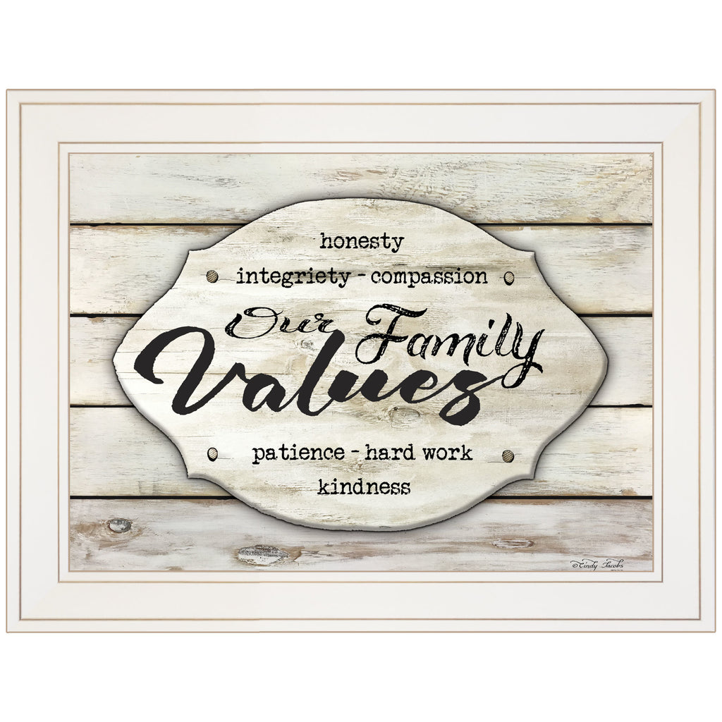 CIN1044-226G "Our Family Values" by artisan Cindy Jacobs. This decorative white framed print (19x15) of family values: honesty, integriety, compassion, patience, hard work and kindness. This framed art is totally American made. The surface of the art is coated with a fade resistant texture which gives it a canvas-like appearance. No glass is necessary. Arrives ready to hang. To view a 2-piece vignette, including this print, please search: V606-226G•Print has fade resistant surface texture, no glass is necessary•Woman Owned Busines (WBE)•Arrives ready to hang, no additional hardware needed on item•individually hand crafted by skilled American workers•frame mitered with precision equipment•Framed art with no glass for safety around children