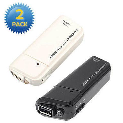The emergency charger comes in Black or White color 2 pack; keep one and share one. It has USB port that can fit most charging cables. It quickly gives you a 2 hour talk time boost for internet use or texting. It is the most handy phone charger that works on your everyday AA batteries found just about any place.