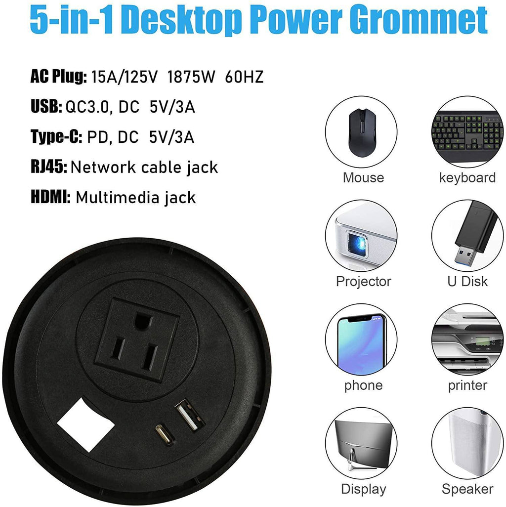 RJ45 can be connected to the network cable, and HDMI can be connected to the projector, computer, printer, is a good helper for office equipment. Two interfaces can be used for a variety of electronic devices, it will leave a clean and tidy look of your desk.You just need to insert the power grommet through the table, fit in table hole of 3.1 diameters. A rotatable three-hole plug is suitable for wire insertion in various direction.Desktop power grommet can support such as computer, iPad, cell phones, lamp, printer, projector, mouse and so on.Eletrical Rating: 125v/10A/1875W/60HZ, Type A port(QC3.0, 5V/3A,9V/2A,12V/1.5A), Type C port(PD power 5V/3A,9V/2A,12V/1.5A). 2 USB Output: 5V/3.4A in total. Wire: 6FT 18AWG. Shell Material: PA66. Heat resistance: 248 °F. Package include: 2 PCS.