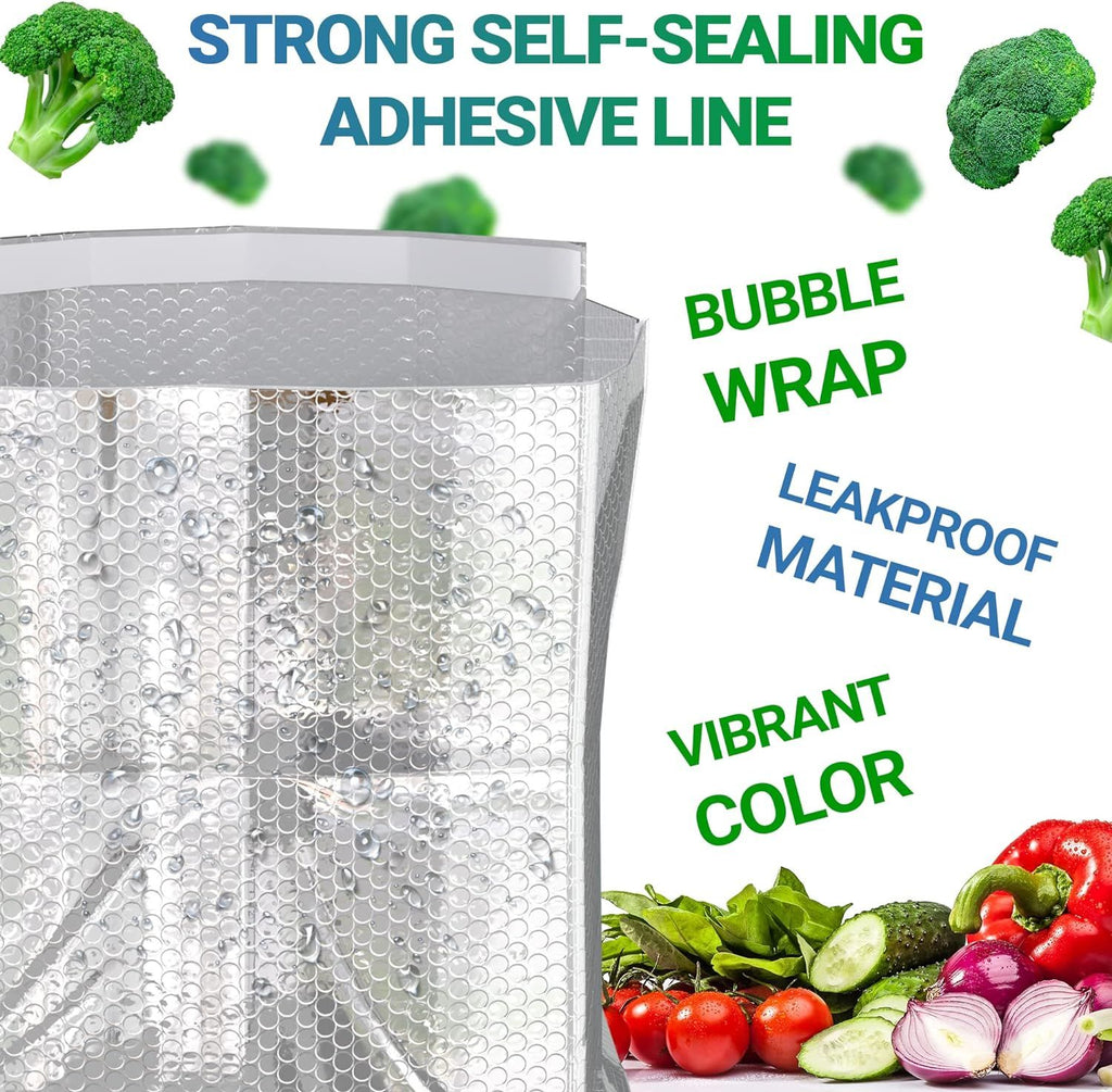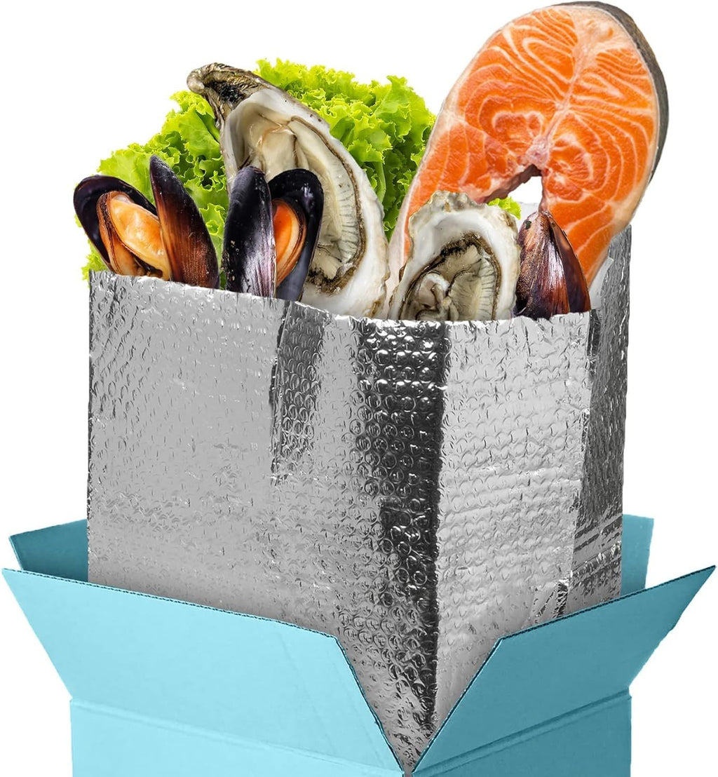 PACK of 5 BOX LINERS with Peel and Seal. Laminated with Metalized Foil. Foil Insulated Box Liners for Cold Shipping. Fits in 8" x 8" x 8" box. Box not included. Manufacturer size tolerance +/- 25". Water-resistant and tear-proof box liner Strong pressure self-seal High profile bubble lining Gusseted bottom Precise fit to your box Insulated thermal box liners are lined with reflective metalized film to keep temperatures consistent during transit while protective bubble lining cushions your items. The bubbles and poly surface prevent conduction and convection heat transfer while the foil reflects 97% of the radiant heat. High quality foil provides greater insulation and control of temperature ranges. Strong; thin; and leak-proof material retards all forms of heat transfer to keep food fresh. This bottom gusseted 3D liner is manufactured with flexible metallized bubble insulating materials that provide high-efficiency thermal protection for a wide range of packaging applications. Packing box liners offer stress-free shipment with their multiple security features. The peel-n-seal closure creates an air-tight; impenetrable finish to prevent contents slipping out and unwanted views of the product inside. .The reinforced cushioning lining protects the interior from damaging forces during the shipment process. Designed to withstand moisture and the tough conditions experienced during shipping that cause rips and shreds. insulated shipper boxes
