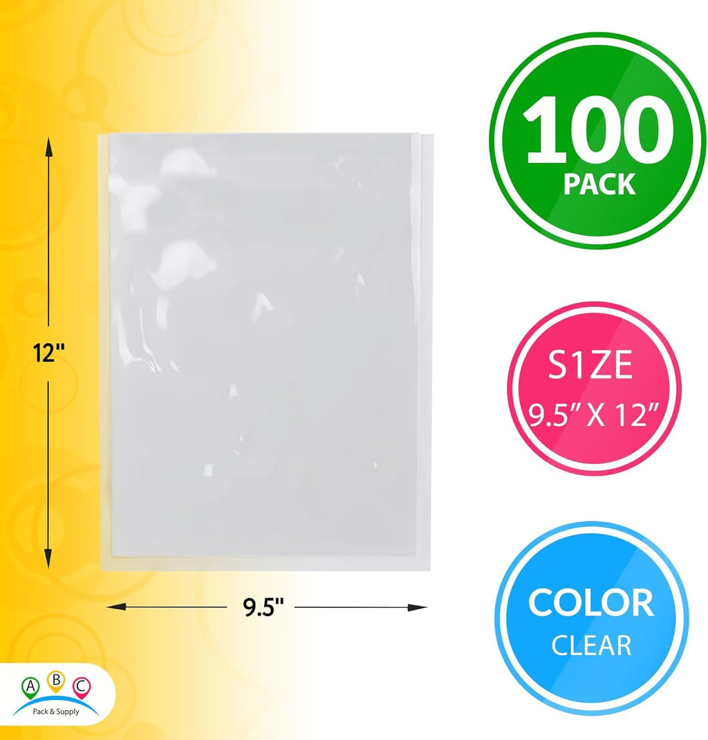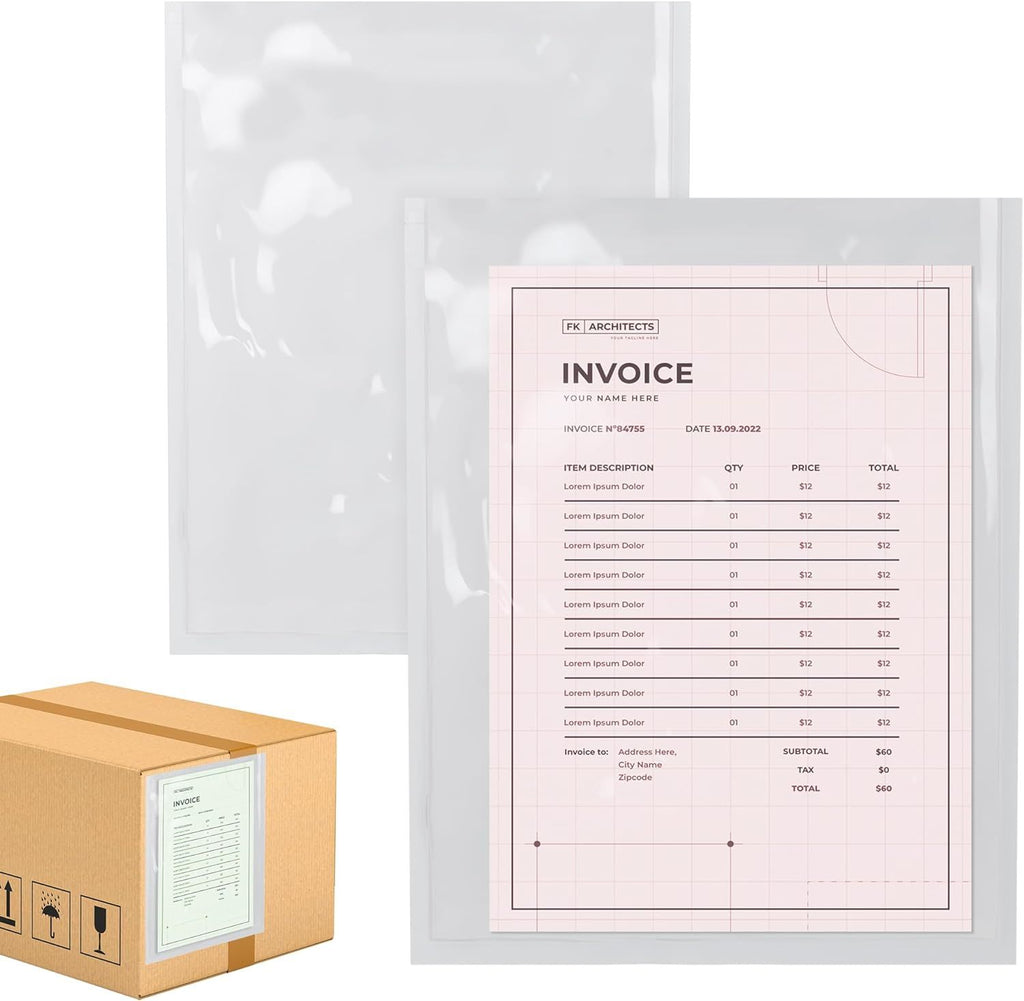 Case of 100 Clear Shipping Label Envelopes 9.5x12. SIZE: Usable Dimensions: 9.5" x 12". COLOR: White with Clear face. PREMIUM QUALITY: Premium adhesive back side sticks instantly to any surface. Provides excellent protection during shipments. Puncture resistant and tamper proof. Clear face packing list sleeve allows the shipper to view the exposed parts of shipping documents without any problem. Fast and hassle-free loading of any standard size labels by all major shipping carriers PEEL & STICK: Pressure sensitive adhesive backside strongly attaches to the outside of packages. Back-loaded envelopes securely hold documents. The slit is on the same side as the self-adhesive material. These envelopes bond instantly to any dry surface. USING: Simply peel the protective backing and stick the pouch to your surface. Then; insert your packing slip in the opening; peel the remaining backing off and press to your surface to seal the packing slip inside the protective clear plastic. Ideal for housing packing lists; order forms; invoices; instructions; pre-printed shipping labels from Paypal; Amazon; FedEx; UPS; and the U.S. Postal Services on the outside of the carton boxes; cases; tubes and other containers. Our Clear label pouches self adhesive also available in next USA standard sizes: 7 x 10 9.5 x 12 10 x 12. packing list enclosed pouches 4.5 x 5.5