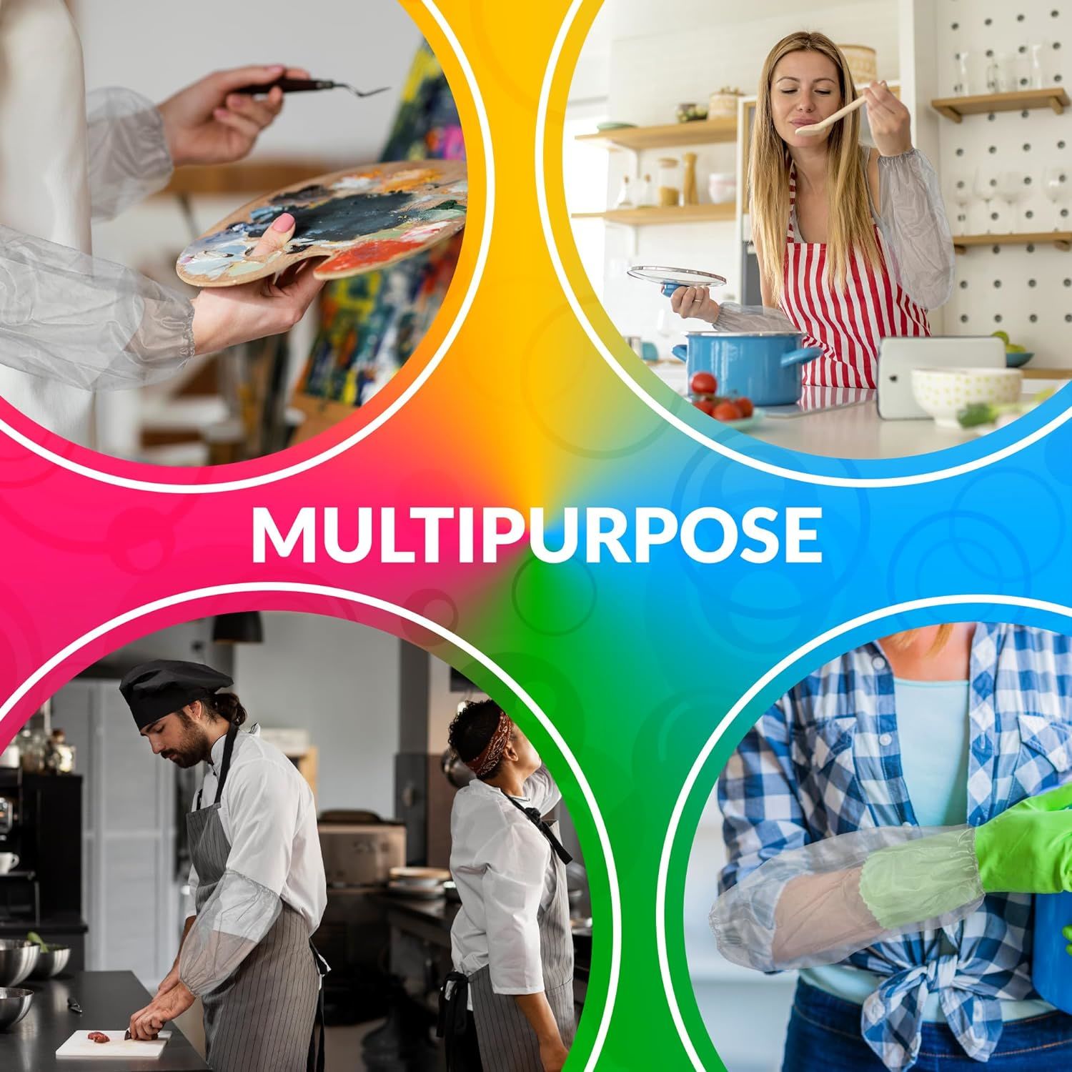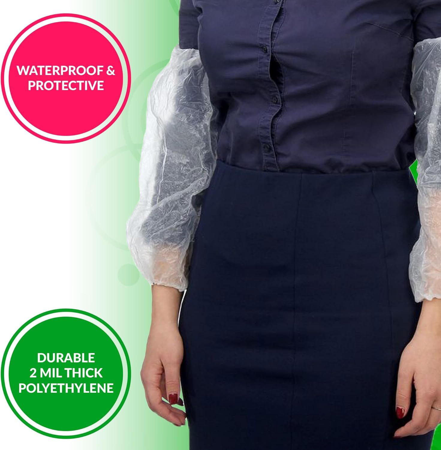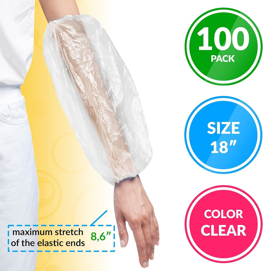 Transparent PE Disposable Sleeves with elastic at both ends for arm protection Color: transparent Size: One size; 18' Quantity: 100 count Ensure clothes stay protected from spills and splatters with these oil resistant over sleeve protectors! Our hand covers have concealed elastication at the wrist and elbow for a secure; comfortable fit. These budget oversleeves offer simple and effective protection. Light-weight and breathable for user comfort. Excellent for one-time use in wet work areas. MONEY BACK GUARANTEE: Disposable poly sleeves are backed by 100% guarantee. If you aren't fully satisfied with product you'll receive your money back!