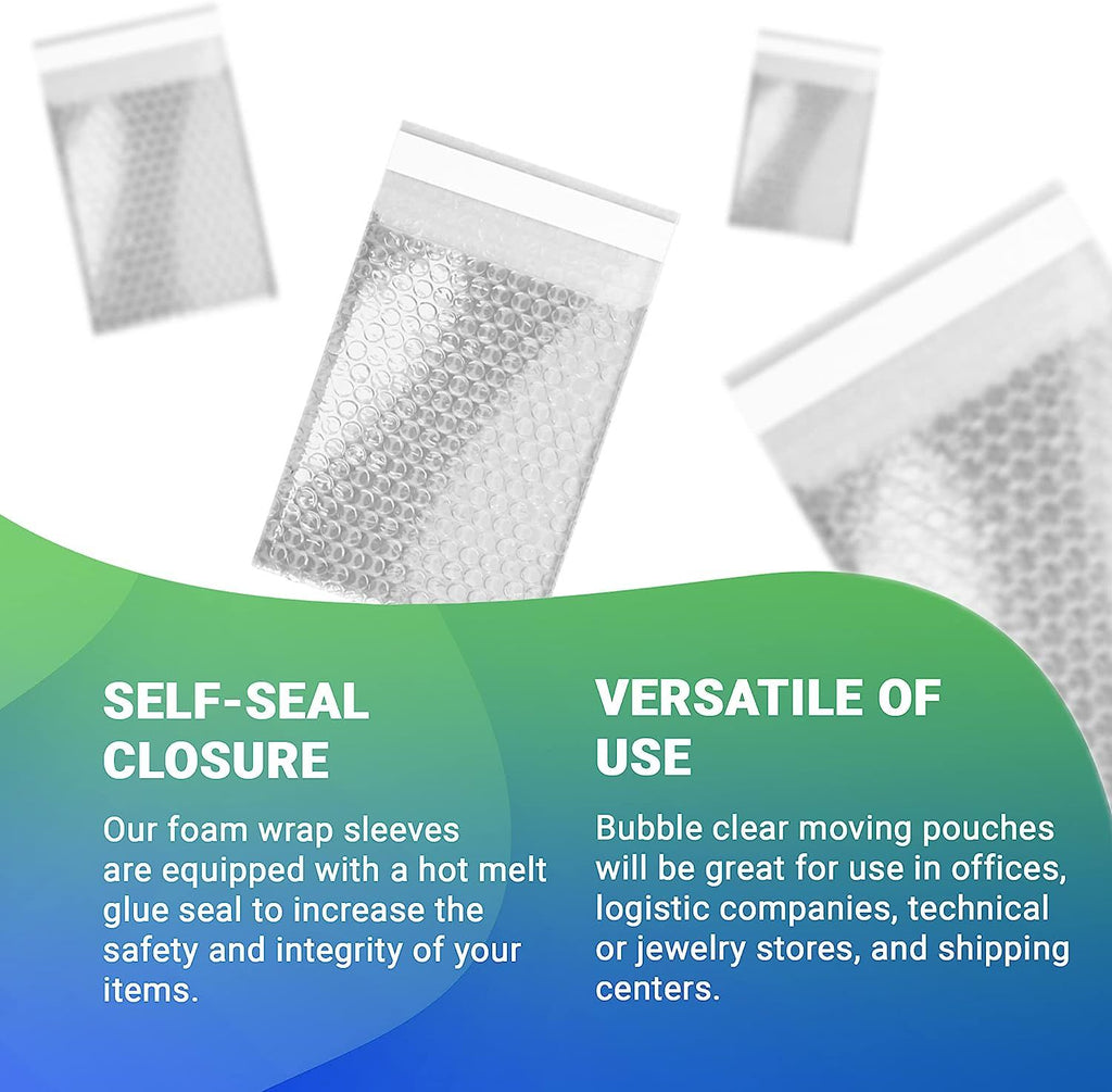 CLEAR BUBBLE OUT POUCHES with Peel and Seal. PACK of 25 plastic padded pouches. Size: 8" x 15.5". Manufacturer size tolerance +/- 25". Plastic shipping bags provide outstanding low cost shipping protection for a wide variety of products. Protect your fragile items with the perfect clear bubble bags. Perfect for storing; moving; and mailing your delicate belongings. Poly bubble out bags are an eco-friendly solution to you moving and storage needs. These packing pouch bags offer stress-free shipment with their multiple security features. Superior cushioning provides more room for your products and prevents tearing with items that have sharp edges. The peel-n-seal closure creates an air-tight; impenetrable finish to prevent contents slipping out. The reinforced cushioning lining protects the interior from damaging forces during the shipment process. Designed to withstand moisture and the tough conditions experienced during shipping that cause rips and shreds. Order in bulk with wholesale price and receive a special video we prepared for our customers!