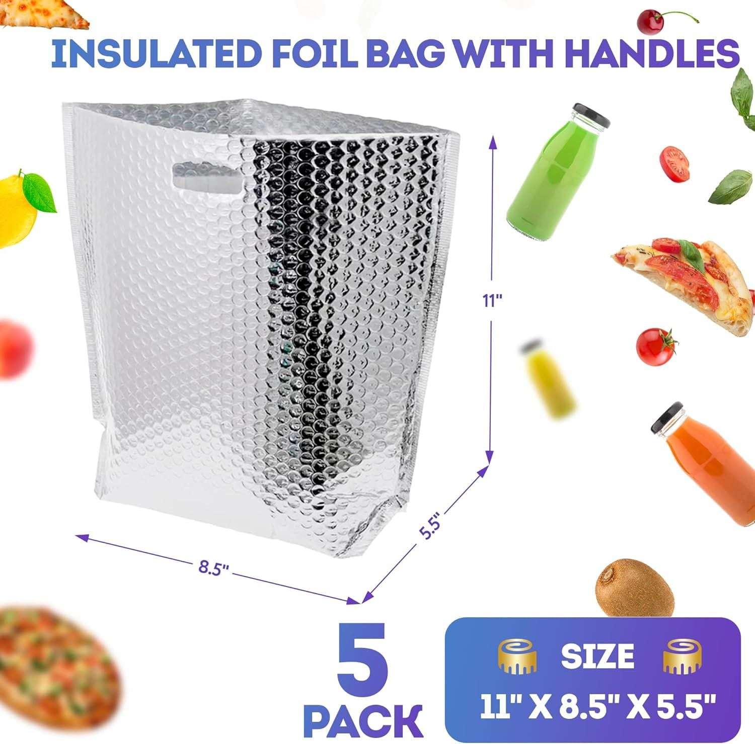 These disposable insulated food bags are designed to offer a singular; high-performance insulation unit; as opposed to dual-layered paper bag and liner combinations that are also available. Each single-use; the thermal bag comes with an integrated handhole and an easy-use adhesive tape seal; making the perfect bag for applications including delivery and transportation of hot or cold food. As well as being used as insulated food delivery bags; thermal bags can also be used for transporting other temperature-sensitive products. These insulated food bags can withstand the weight of a very large quantity of food products. Our in-house testing has indicated the bags can safely carry more than 22lbs of temperature-sensitive produce. The thermal bags are made with gusseted corners; meaning they fit neatly inside your corrugated cartons. Hot and cold food deliveries are perfect examples of uses for these Insulated Delivery Bags. Food can be loaded in seconds; whether at a takeaway or a supermarket; and sealed and sent on it's way while effectively containing the inside temperature; keeping hot food hot and cold food cold. Insulated shipping bags are suitable for shipping a wide range of products ranging from perishable food items; pharmaceuticals; dairy products; and any other temperature-sensitive product. Provides long time protection for your overnight shipments of chocolate or pharmaceuticals. Foil insulated bubble bags are recommended for protecting refrigerated; carton-sized shipments against extreme temperatures for more than 24 hours.Fits in 11" x 8.5" x 5.5" box. Box not included.