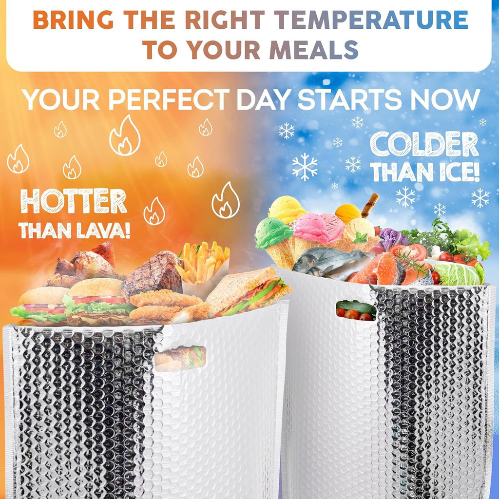 These disposable insulated food bags are designed to offer a singular; high-performance insulation unit; as opposed to dual-layered paper bag and liner combinations that are also available. Each single-use; the thermal bag comes with an integrated handhole and an easy-use adhesive tape seal; making the perfect bag for applications including delivery and transportation of hot or cold food. As well as being used as insulated food delivery bags; thermal bags can also be used for transporting other temperature-sensitive products. These insulated food bags can withstand the weight of a very large quantity of food products. Our in-house testing has indicated the bags can safely carry more than 22lbs of temperature-sensitive produce. The thermal bags are made with gusseted corners; meaning they fit neatly inside your corrugated cartons. Hot and cold food deliveries are perfect examples of uses for these Insulated Delivery Bags. Food can be loaded in seconds; whether at a takeaway or a supermarket; and sealed and sent on it's way while effectively containing the inside temperature; keeping hot food hot and cold food cold. Insulated shipping bags are suitable for shipping a wide range of products ranging from perishable food items; pharmaceuticals; dairy products; and any other temperature-sensitive product. Provides long time protection for your overnight shipments of chocolate or pharmaceuticals. Foil insulated bubble bags are recommended for protecting refrigerated; carton-sized shipments against extreme temperatures for more than 24 hours.