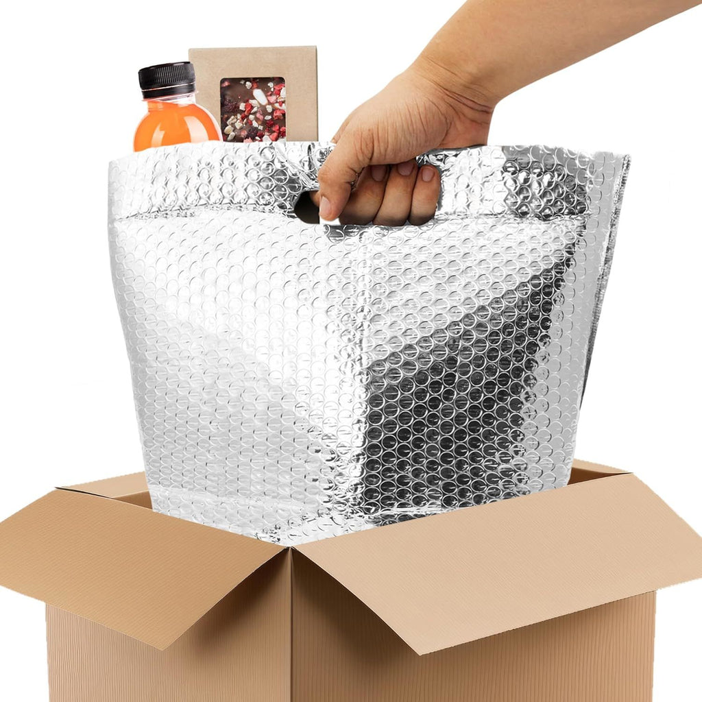 These disposable insulated food bags are designed to offer a singular; high-performance insulation unit; as opposed to dual-layered paper bag and liner combinations that are also available. Each single-use; the thermal bag comes with an integrated handhole and an easy-use adhesive tape seal; making the perfect bag for applications including delivery and transportation of hot or cold food. As well as being used as insulated food delivery bags; thermal bags can also be used for transporting other temperature-sensitive products. These insulated food bags can withstand the weight of a very large quantity of food products. Our in-house testing has indicated the bags can safely carry more than 22lbs of temperature-sensitive produce. The thermal bags are made with gusseted corners; meaning they fit neatly inside your corrugated cartons. Hot and cold food deliveries are perfect examples of uses for these Insulated Delivery Bags. Food can be loaded in seconds; whether at a takeaway or a supermarket; and sealed and sent on it's way while effectively containing the inside temperature; keeping hot food hot and cold food cold. Insulated shipping bags are suitable for shipping a wide range of products ranging from perishable food items; pharmaceuticals; dairy products; and any other temperature-sensitive product. Provides long time protection for your overnight shipments of chocolate or pharmaceuticals. Foil insulated bubble bags are recommended for protecting refrigerated; carton-sized shipments against extreme temperatures for more than 24 hours.