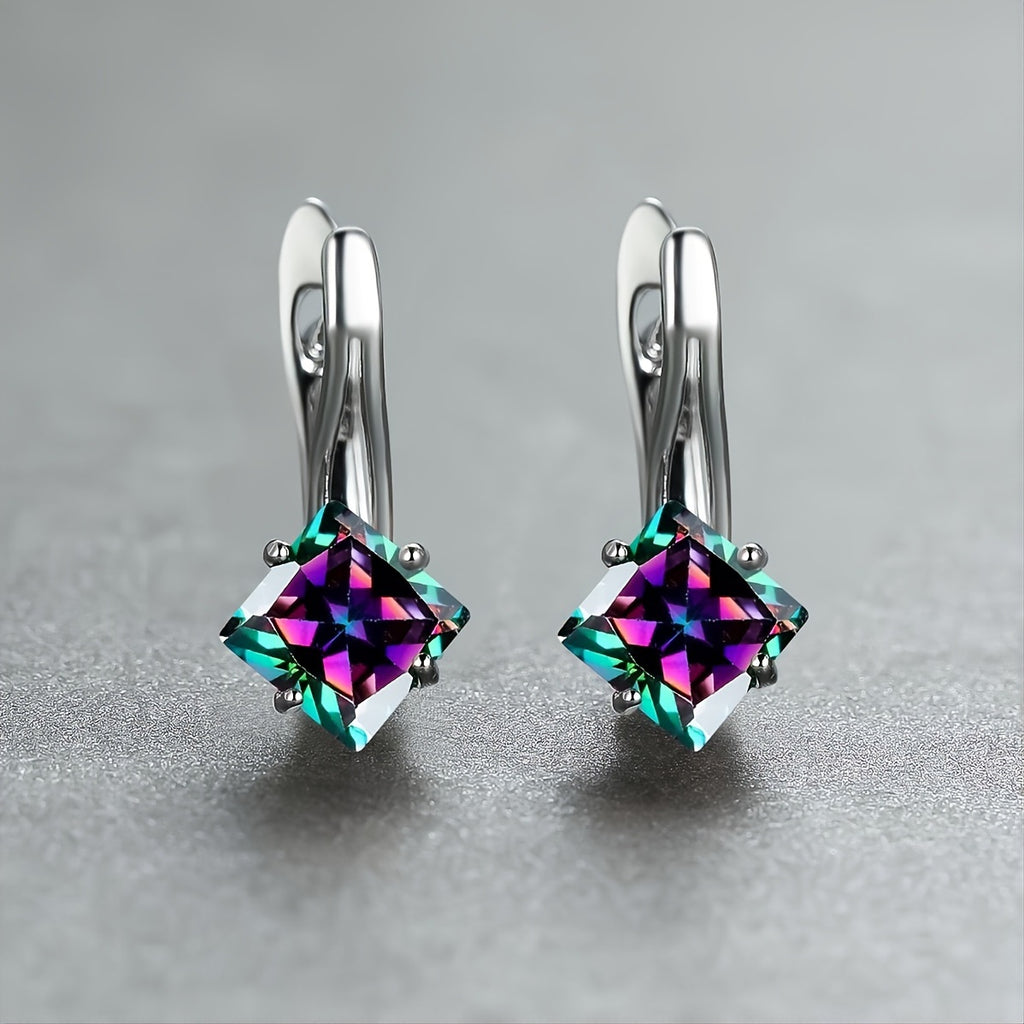 1 Pair Silver Color Princess Cut Blue Green Red White Rainbow Stone Clip Earrings Birthstone Bride Princess Engagement Drop Dangle Earrings