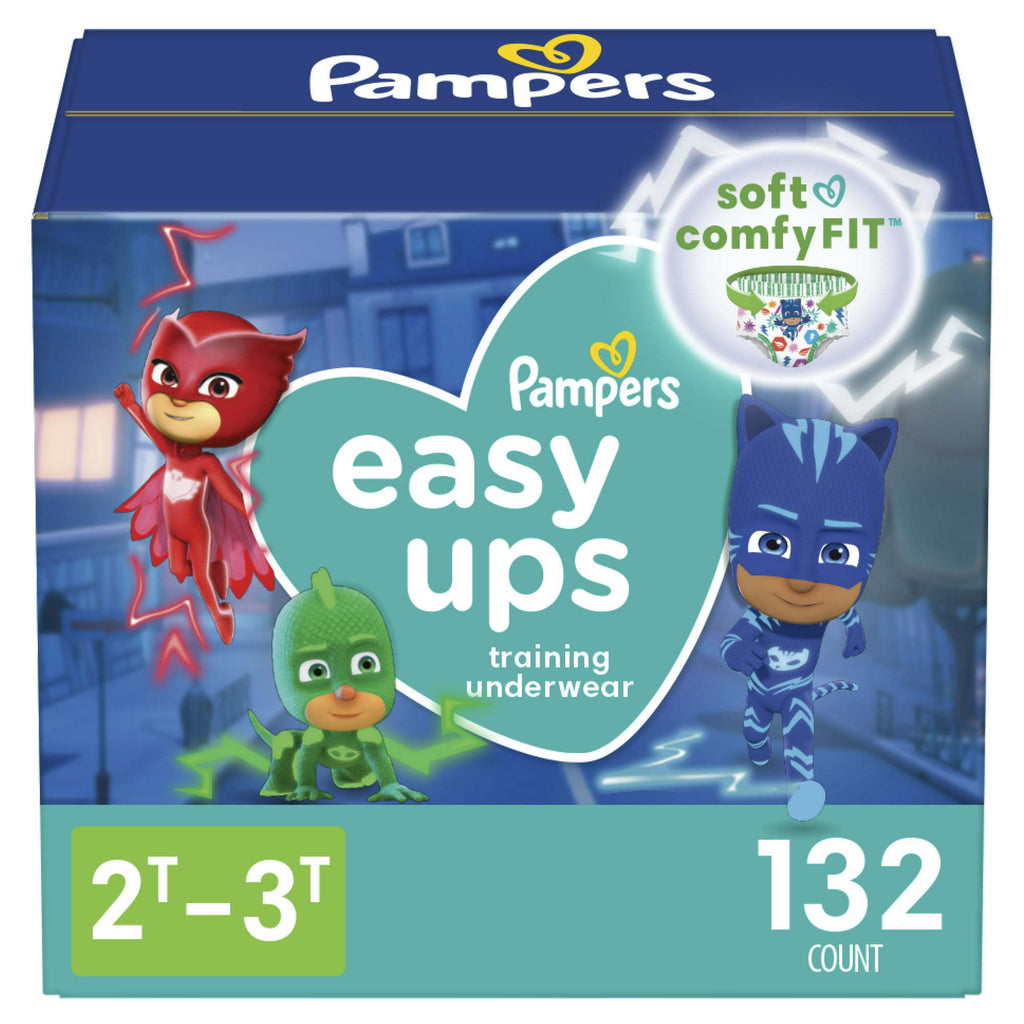 Potty-train like a hero with PJ Masks Pampers Easy Ups Training Pants. Featuring your favorite heroes Catboy, Owlette and Gekko, these super soft and comfy training pants fit just like real cotton undies with a 360 stretchy waistband that is gentle on your child’s skin and easy to pull up and down. Plus, they’re dermatologically tested, hypoallergenic, and free of parabens and latex.* That’s just one of the many reasons Pampers is the #1 pediatrician recommended brand. When it comes to potty accidents, your toddler will be covered with up to 100% leakproof protection. To protect where leaks happen most, Easy Ups are made with Dual Leak-Guard Barriers around the leg cuffs while Extra Absorb Channels quickly absorb accidents and lock them away from your toddler's skin. And when it's time to take them off, Easy-Tear Sides make removal and disposal a cinch. Potty-training is a journey and can take your toddler 90 days on average to catch on. So, Pampers Easy Ups makes it easy with each box containing a one-month supply of training pants. Available in sizes 2T–3T (16–34 lb), 3T–4T (30–40 lb), 4T–5T (37+ lb) and 5T– 6T (41+ lb). *Natural Rubber