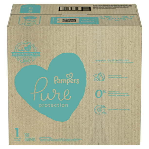 Your search for pure protection that works is over! Designed to help skin stay dry and healthy, PampersPure Protection diapers lock wetness away from skin for up to 12 hours for outstanding leakage protection withskin-loving care. Plus, our designer, boutique prints make Pampers Pure just as precious as they are protecting.We've thoughtfully chosen all of our ingredients to care for your baby's precious skin. Our exclusive, plant-basedliner** is enriched with shea butter to help nourish and protect skin while our outercover is enhanced withpremium cotton, making Pampers Pure Protection diapers irresistibly soft and breathable. But the ingredientswe've chosen to leave out are just as important. That's why Pampers Pure Protection diapers are free of elemental chlorine, fragrance, parabens, and latex* and are hypoallergenic.*Natural rubber**Plant-based and polypropylene blend The Seal of Cotton and cotton enhanced are trademarks of Cotton Incorporated. cotton enhanced softoutercover contains 15% cotton.