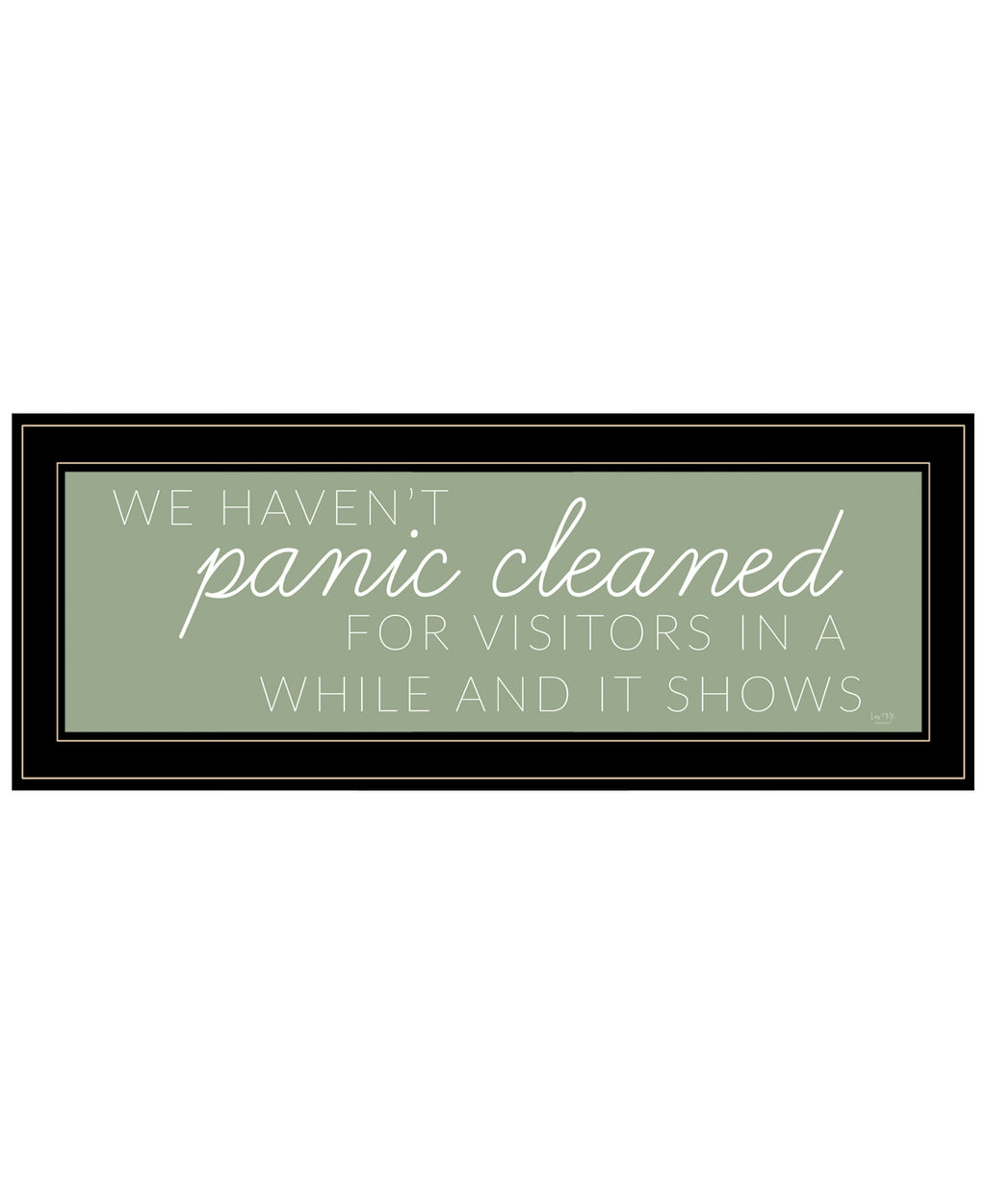 "Panic Cleaned" is by Artisan Lux+ Me Designs. This 21"X9" decorative black framed wall art. This humors wall art features a play on words with a few different font styles and sizes. The typographic art reads "We haven't panic cleaned for visitors in a white and it shows.". Our products are proudly made by skilled American workers. The surface of our framed art is textured with a fade resistant coating, so no glass is necessary. A vegetable-based glue is used in the production of our products, and our frames are crafted from 100% recycled material. In keeping with our environmentally friendly approach towards manufacturing. Arrives ready to hang.•Print has fade resistant surface texture, no glass is necessary•Woman Owned Business (WBE)•Arrives ready to hang, no additional hardware needed on item•individually hand crafted by skilled American workers•Cleaning Instructions: Clean with Soft Dry Cloth Only•Made in U.S.A.•Artwork by American Artist
