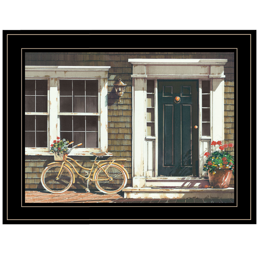 JR349-704G "Parked Out Front" by artisan John Rossini. This decorative black framed print (19x15) of a bike parked out in front of a flower shop; with flowers in its basket. Old shop in need of paint; This framed art is totally American made. The surface of the art is coated with a fade resistant texture which gives it a canvas-like appearance. No glass is necessary. Arrives ready to hang. To view a 2-piece vignette, including this print, please search: V619-704G•Print has fade resistant surface texture, no glass is necessary•Woman Owned Busines (WBE)•Arrives ready to hang, no additional hardware needed on item•individually hand crafted by skilled American workers•frame mitered with precision equipment•Framed art with no glass for safety around children