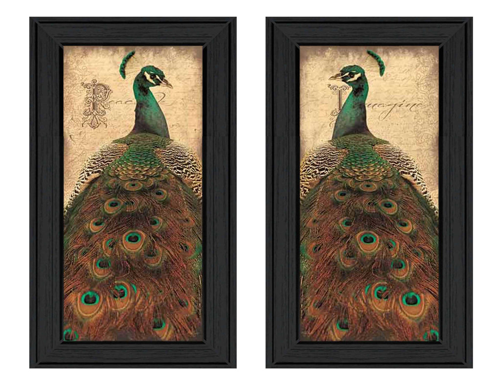 Peacock (B) is 2 - 11"x20" framed prints by artist John Jones. This 2 piece collection consists of: Peace this features a beautiful peacock looking to the right with the word Peace. Imagine features a beautiful peacock looking to the left with the word Imagine. This collection comes textured and is ready to hang.•Women Owned (WBE)•Textured Artwork with a 'rolled on' acid free acrylic coating to create a canvas painting effect. No glass is necessary.•UV protectant coating protects artwork from fading.•MDF moulding adds natural beauty to the framed art. Frame is keyholed for ease of hanging.