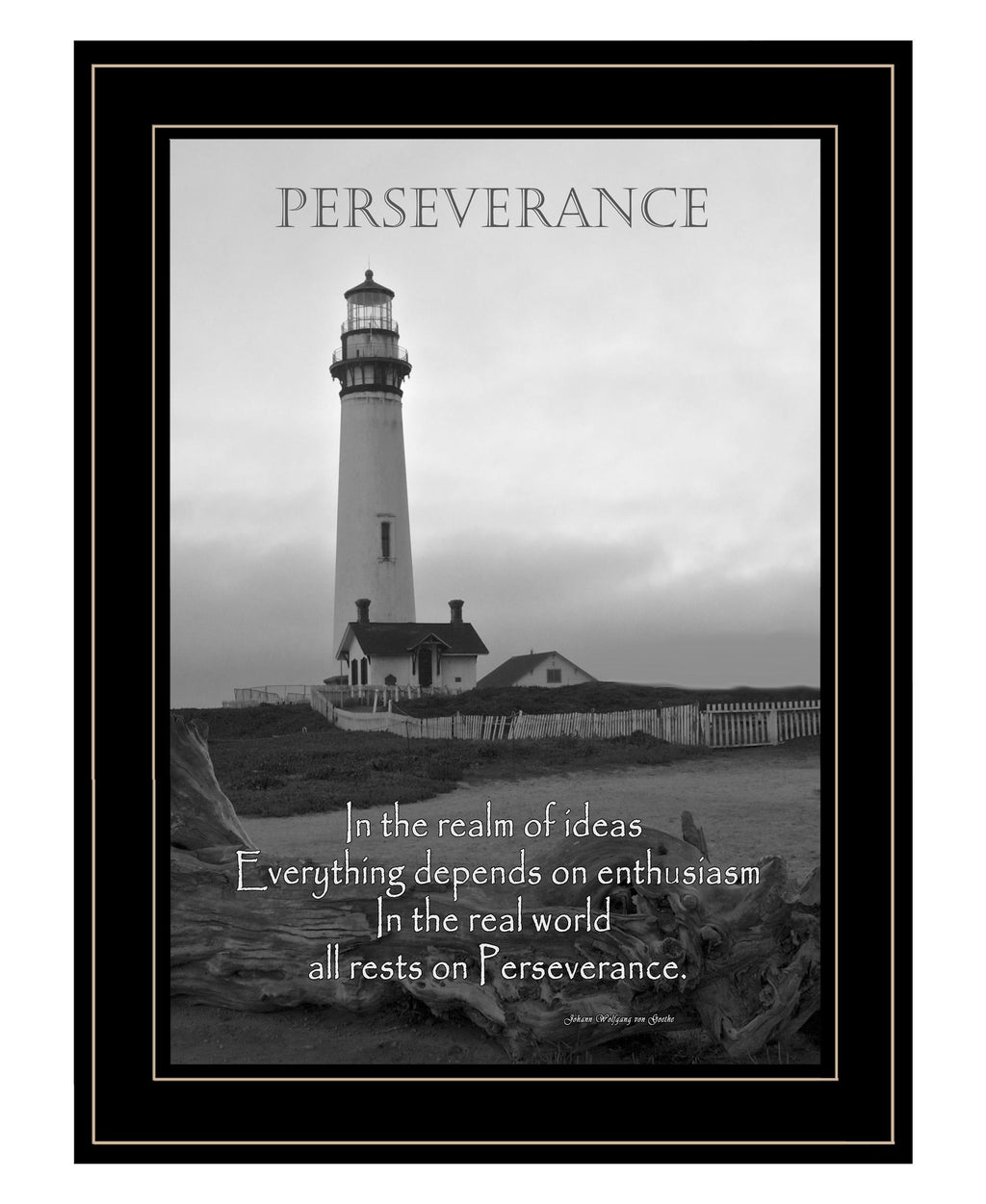 "Perseverance (Grayscale)" is by Artisan Trendy Decor 4U. This 15"X19" decorative black framed wall art. Perseverance: In the realm of ideas, everything depends on enthusiasm. In the real world all rests on Perseverance. Our products are proudly made by skilled American workers. The surface of our framed art is textured with a fade resistant coating, so no glass is necessary. A vegetable-based glue is used in the production of our products, and our frames are crafted from 100% recycled material. In keeping with our environmentally friendly approach towards manufacturing. Arrives ready to hang.•Print has fade resistant surface texture, no glass is necessary•Woman Owned Business (WBE)•Arrives ready to hang, no additional hardware needed on item•individually hand crafted by skilled American workers•Cleaning Instructions: Clean with Soft Dry Cloth Only•Made in U.S.A.•Artwork by American Artist