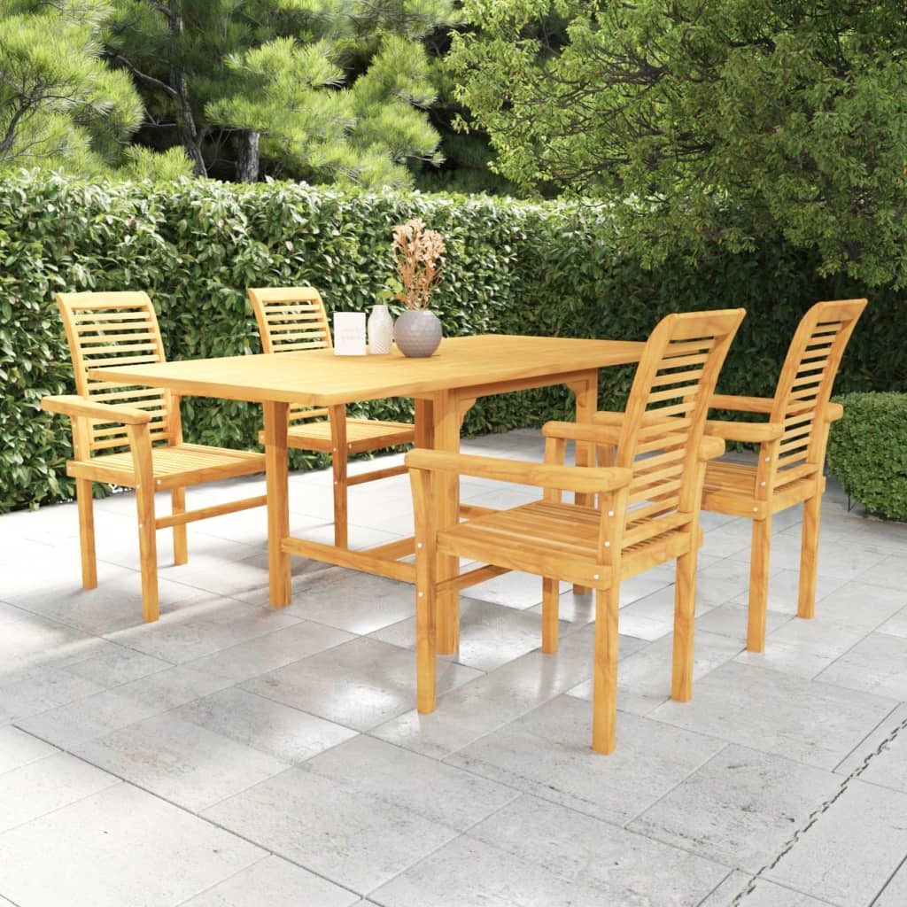 The set is applied with a beautiful finish to give the wood a warm color. With its special design, the dining table can be extended at most 63" when extra space is required. It also has a hole for an umbrella to provide protection against the sun. Thanks to the ergonomically designed back and armrests, these garden chairs are comfortable to sit on and are stackable to save space when not in use. Additionally, this set is easy to clean with a damp cloth.