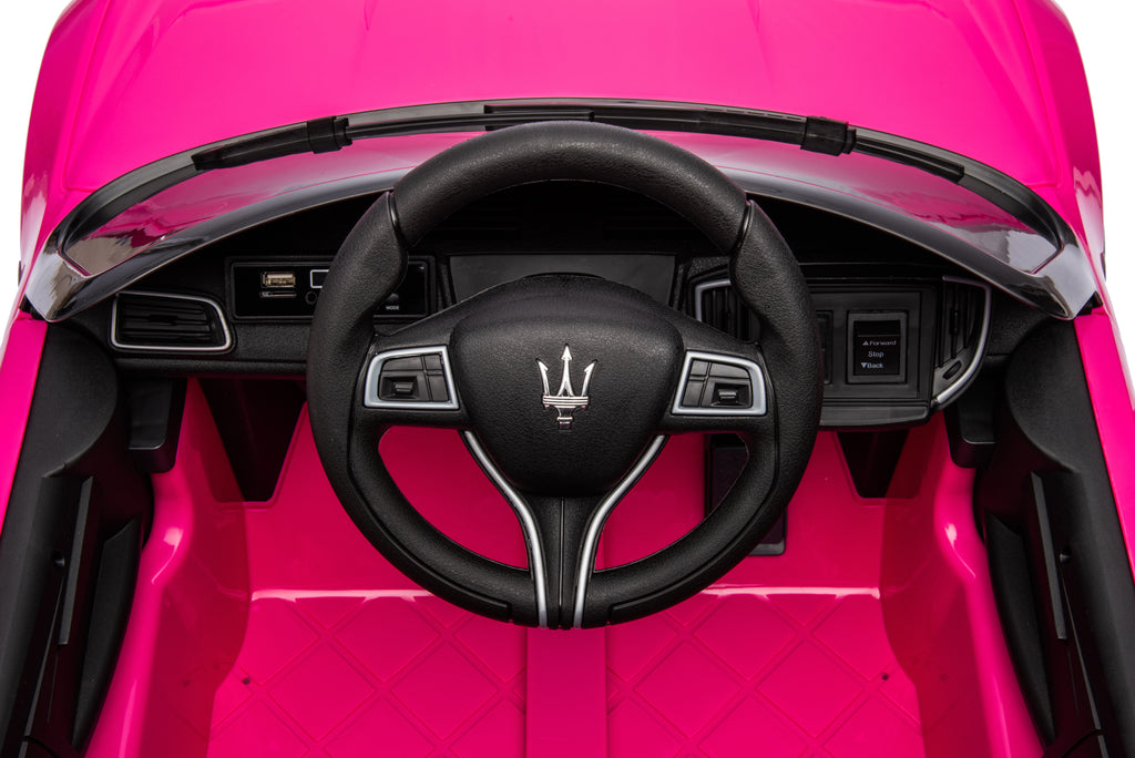 [Perfect Gift for Any Child]: Our kids ride on car is a perfect gift for your kid's birthday and Christmas. Real Maserati appearance makes it a real eye-catcher. Ergonomic and spacious seat offers kids a large sitting space. Front handle and 2 support wheels can enable you to easily move the vehicle when the car battery runs down.