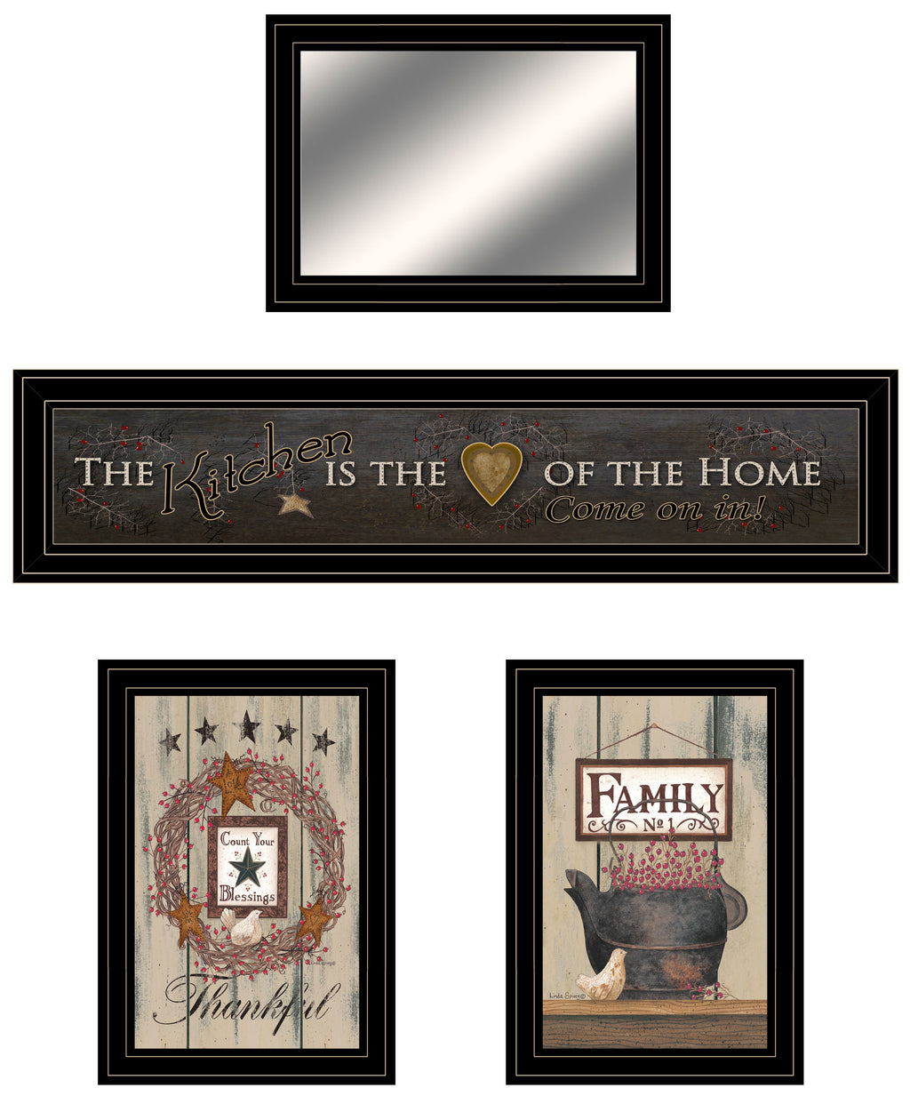 VME650HPKM-704GM "Primitive Kitchen" By Trendy Decor 4U. Four Piece Kitchen Collection features Handmade Decorative black (12x15) framed mirror by Trendy Decor 4U. Includes 3 black framed prints: "Heart of the Home" (33x9), "Count Your Blessings" (15x19), and "Family No.1" (15x19). The surface of the art is coated with a fade resistant texture which gives it a canvas-like appearance. No glass is necessary. Arrives ready to hang. Made in USA.•Women Owned (WBE)•Textured Artwork with a 'rolled on' acid free acrylic coating to create a canvas painting effect. No glass is necessary.•UV protectant coating protects artwork from fading.•Molding adds natural beauty to the framed art. Frame is keyholed for ease of hanging.•Frame is keyholed for ease of hanging.