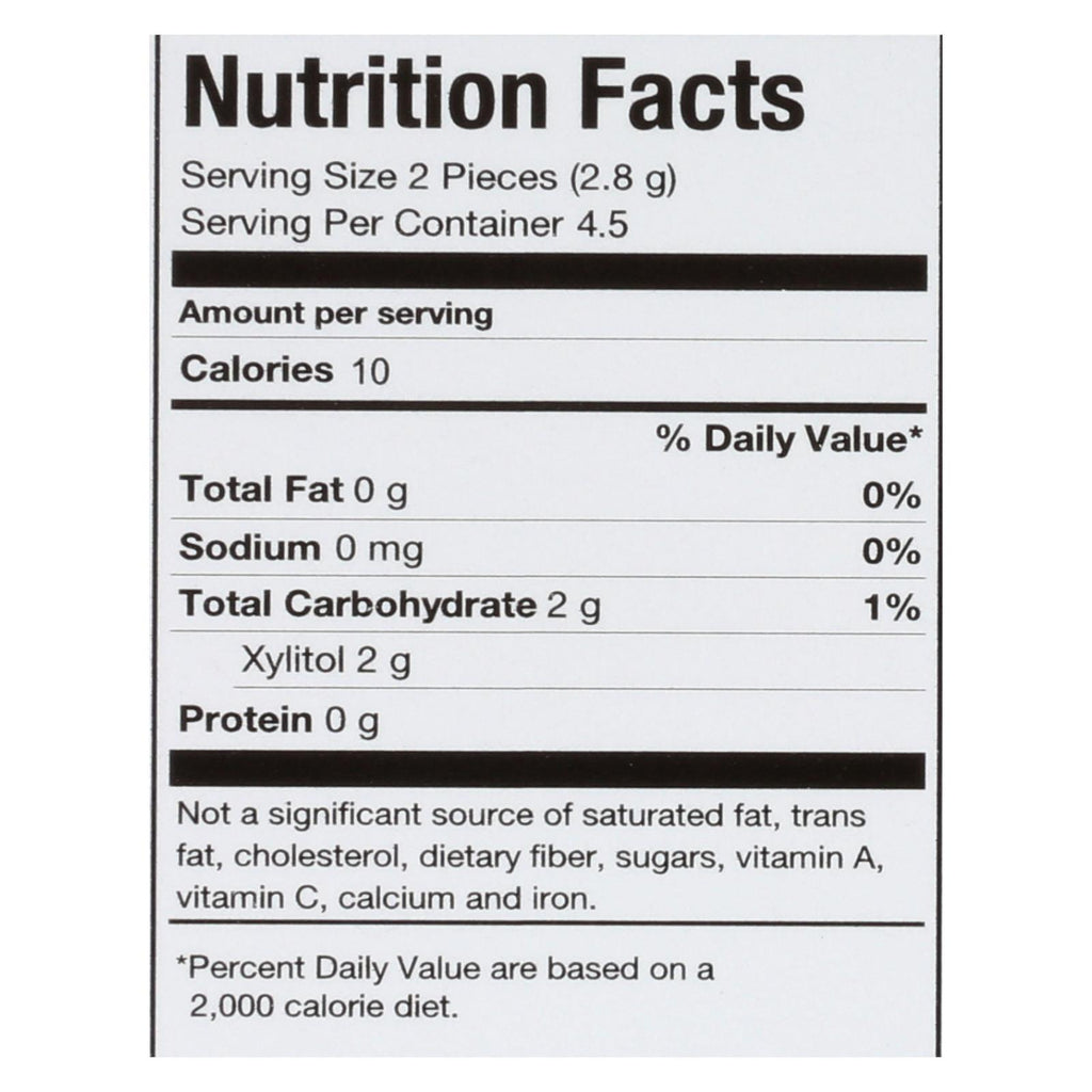 ingredients : xylitol;gum base;gum arabic;natural flavors;glycerol;malic acid;citric acid;carnauba wax;tocopherols