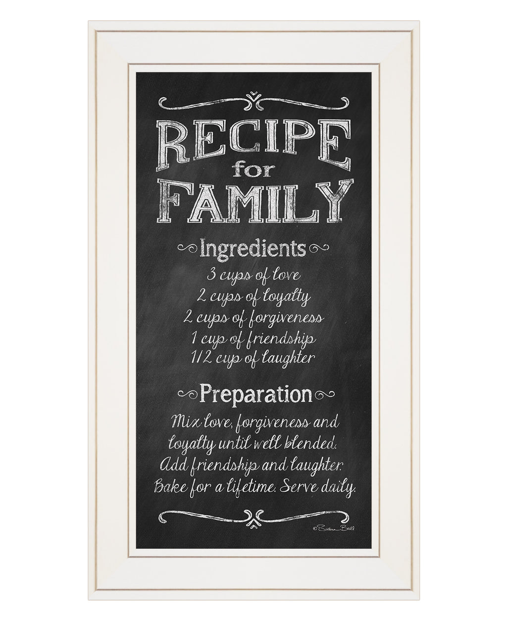 "Recipe for Family" is by Artisan Susan Ball. This 12"X21" decorative black framed wall art. This image features a Recipe for a happy family. This image is over layer on a black chalkboard like background. Our products are proudly made by skilled American workers. The surface of our framed art is textured with a fade resistant coating, so no glass is necessary. A vegetable-based glue is used in the production of our products, and our frames are crafted from 100% recycled material. In keeping with our environmentally friendly approach towards manufacturing. Arrives ready to hang.•Print has fade resistant surface texture, no glass is necessary•Woman Owned Business (WBE)•Arrives ready to hang, no additional hardware needed on item•individually hand crafted by skilled American workers•Cleaning Instructions: Clean with Soft Dry Cloth Only•Made in U.S.A.•Artwork by American Artist