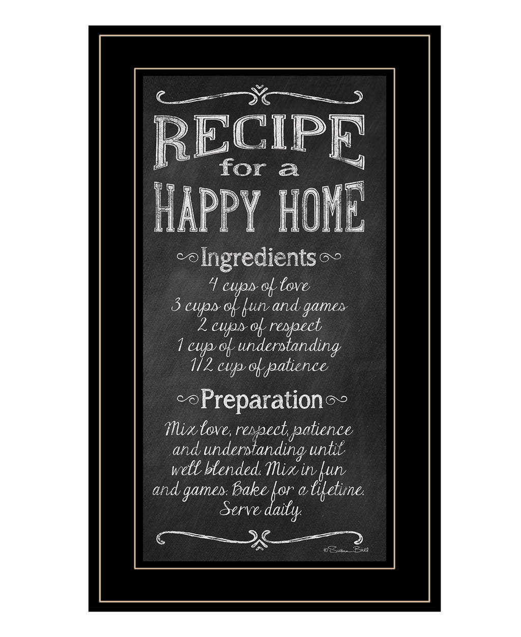 "Recipe for a Happy Home" is by Artisan Susan Ball. This 12"X21" decorative black framed wall art. This image features a Recipe for a Happy Home this image is over layer on a black chalkboard like background. The script reads' Ingredients 4 cups of love, 3 cups of fun and games, 2 cups of respect, 1 cup of understanding, ½ cup of patience Preparation mix love, respect, patience and understanding until well blended. Mix in fun and games. Bake for a lifetime. Serve daily.'. Our products are proudly made by skilled American workers. The surface of our framed art is textured with a fade resistant coating, so no glass is necessary. A vegetable-based glue is used in the production of our products, and our frames are crafted from 100% recycled material. In keeping with our environmentally friendly approach towards manufacturing. Arrives ready to hang.•Print has fade resistant surface texture, no glass is necessary•Woman Owned Business (WBE)•Arrives ready to hang, no additional hardware needed on item•individually hand crafted by skilled American workers•Cleaning Instructions: Clean with Soft Dry Cloth Only•Made in U.S.A.•Artwork by American Artist