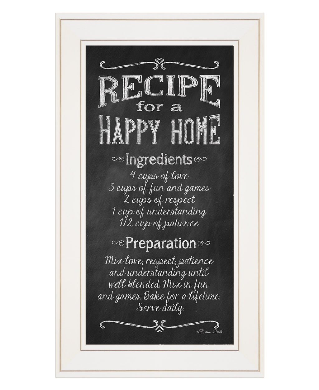 "Recipe for a Happy Home" is by Artisan Susan Ball. This 12"X21" decorative white framed wall art. This image features a Recipe for a Happy Home this image is over layer on a black chalkboard like background. The script reads' Ingredients 4 cups of love, 3 cups of fun and games, 2 cups of respect, 1 cup of understanding, ½ cup of patience Preparation mix love, respect, patience and understanding until well blended. Mix in fun and games. Bake for a lifetime. Serve daily.'. Our products are proudly made by skilled American workers. The surface of our framed art is textured with a fade resistant coating, so no glass is necessary. A vegetable-based glue is used in the production of our products, and our frames are crafted from 100% recycled material. In keeping with our environmentally friendly approach towards manufacturing. Arrives ready to hang.•Print has fade resistant surface texture, no glass is necessary•Woman Owned Business (WBE)•Arrives ready to hang, no additional hardware needed on item•individually hand crafted by skilled American workers•Cleaning Instructions: Clean with Soft Dry Cloth Only•Made in U.S.A.•Artwork by American Artist