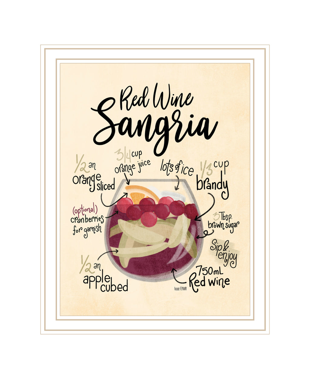 "Red Wine Sangria" is by Artisan House Fenway. This 14"X18" decorative white framed wall art. This image features the perfect instructions on how to make a Red Wine Sangria. Our products are proudly made by skilled American workers. The surface of our framed art is textured with a fade resistant coating, so no glass is necessary. A vegetable-based glue is used in the production of our products, and our frames are crafted from 100% recycled material. In keeping with our environmentally friendly approach towards manufacturing. Arrives ready to hang.•Print has fade resistant surface texture, no glass is necessary•Woman Owned Business (WBE)•Arrives ready to hang, no additional hardware needed on item•individually hand crafted by skilled American workers•Cleaning Instructions: Clean with Soft Dry Cloth Only•Made in U.S.A.•Artwork by American Artist