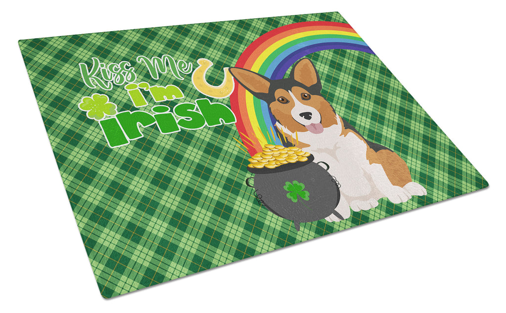 Glass Cutting Board featuring breed specific Corgi artwork. Celebrate St Patrick's Day with this St Patrick's Day Cutting Board. This Glass Cutting Board is from Caroline's Treasures collection Kiss me I'm Irish. Introduce your kitchen to the vibrant, large Decorative Glass Cutting Board from Caroline's Treasures. Crafted from resilient tempered glass, this board is not only a utilitarian necessity but also a colorful art piece. With its generous dimensions of 15 inches in height and 12 inches in length, it offers ample space for all your cutting needs. Every piece showcases captivating artwork from distinguished artists, bringing an aesthetic edge to your kitchen. Beyond its attractive design, this cutting board ensures your countertop stays pristine and unscathed, owing to its heat-resistant properties. Engineered with user convenience in mind, it features non-skid feet for stability, and rounded corners for additional safety. Its robust construction renders it virtually unbreakable, guaranteeing longevity. The board comes with protective feet bumpers, maintaining its position during use. This product is recommended to be hand washed only. Proudly printed and assembled in the United States, this cutting board exemplifies superior craftsmanship. With Caroline's Treasures' Decorative Glass Cutting Board, you're investing in a blend of functionality and artistic flair.