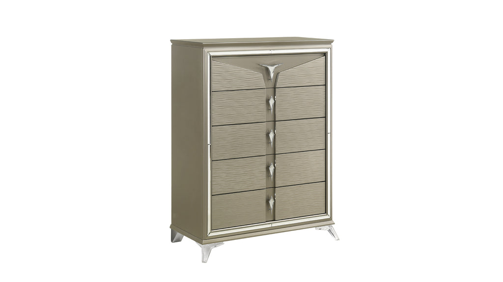 This wood 5-drawer chest offers both storage and style with its contemporary design and mirror-accented wood drawer handles. With ample space for your clothing and accessories, it continues the enchanting levitating theme with its transparent acrylic legs. Elevate your storage solutions while maintaining the collection's overall elegance and charm.