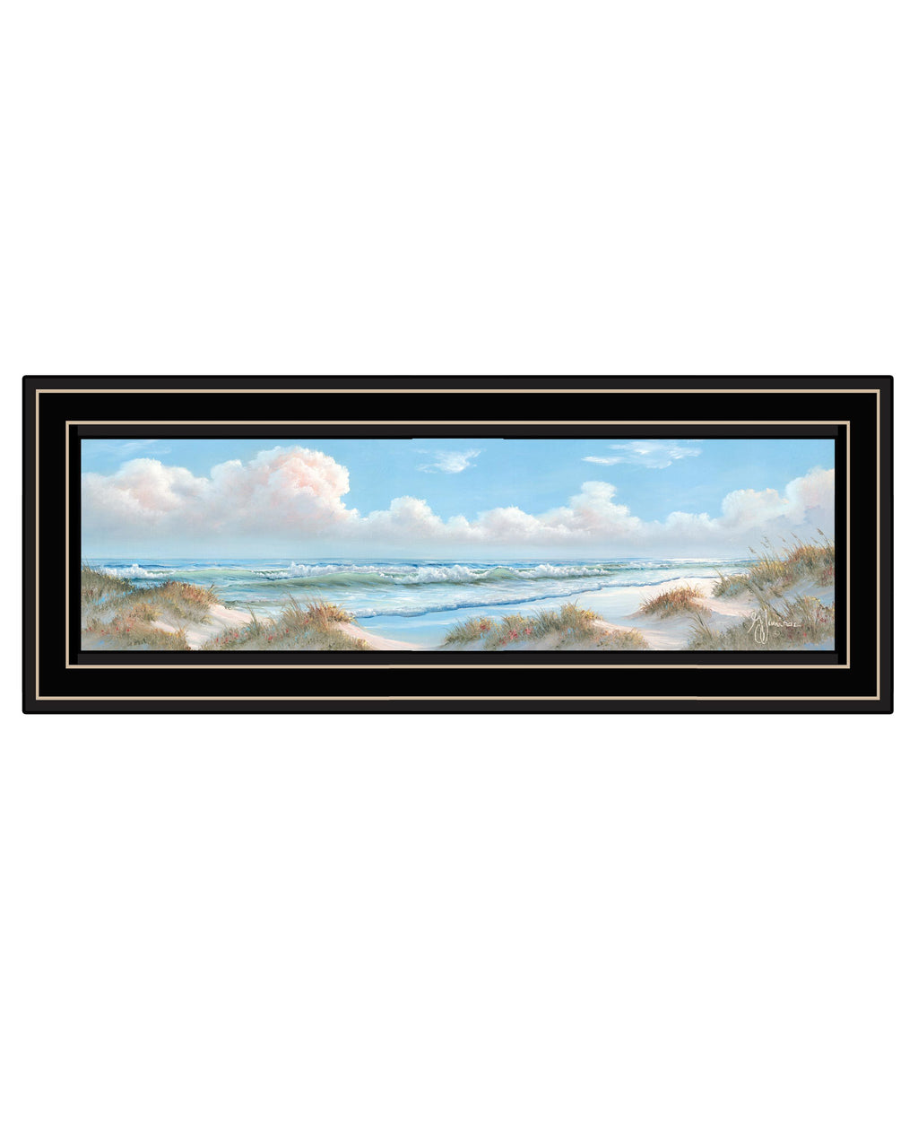 "Seascape I" is by Artisan Georgia Janisse. This 21"X9" decorative black framed wall art. This perfect ocean view makes you wish you were at the beach, with the clouds laying over the beach, while the waves come crashing into a calm beach. This decorative wall art would look perfect in any location. Our products are proudly made by skilled American workers. The surface of our framed art is textured with a fade resistant coating, so no glass is necessary. A vegetable-based glue is used in the production of our products, and our frames are crafted from 100% recycled material. In keeping with our environmentally friendly approach towards manufacturing. Arrives ready to hang.•Print has fade resistant surface texture, no glass is necessary•Woman Owned Business (WBE)•Arrives ready to hang, no additional hardware needed on item•individually hand crafted by skilled American workers•Cleaning Instructions: Clean with Soft Dry Cloth Only•Made in U.S.A.•Artwork by American Artist