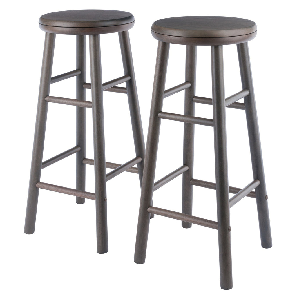 Beautifully simple and designed to harmonize with any decor from modern to rustic these Winsome 2 Pc Shelby Swivel Seat Bar Stools are a perfect fit for your home. Their conservative leg footprint makes them ideal for smaller dining areas or apartment living. Constructed of all Solid Wood each stool features a smooth circular swivel seat so you can always be turned to the conversation or big moments in the game. Draw them up to a home bar or high table for a relaxing get together with friends or use them for extra seating when needed. The 30 inch high stools are finished in a contemporary Oyster Gray and swivel neatly over round slightly tapered legs. Double sets of crossbars ensure stability while also serving as convenient footrests. Static weight limit is 220 lbs Conveniently packed and shipped in 1 box that includes the hardware needed for assembly. Assembled size 30.2 in H x 13.99 in W x 13.99 in DSeat diameter 12.99 inFootprint 13.3 in W x 13.3 in DStatic weight capacity 220 lbs.Assembly requiredShips in 1 box