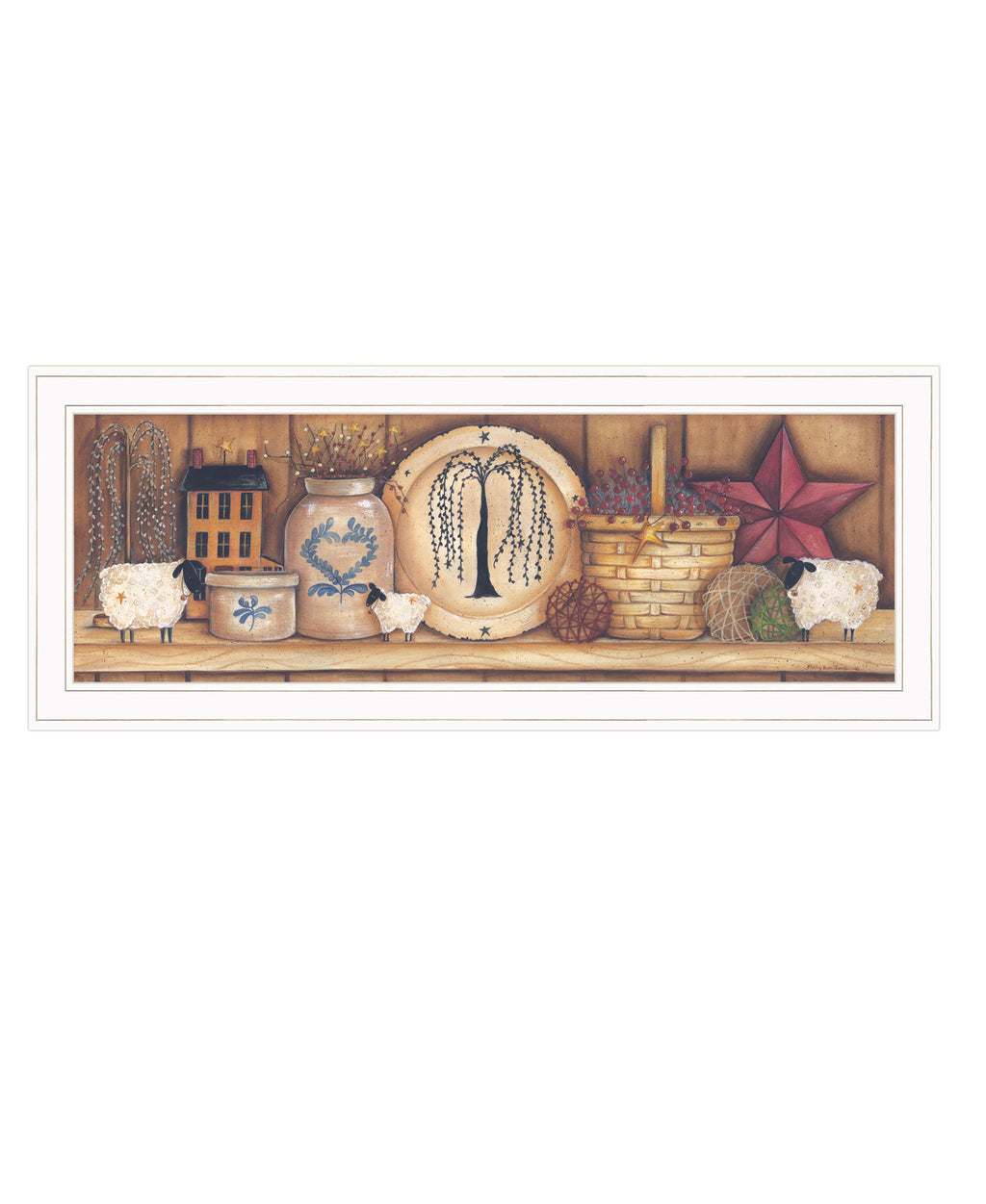 "Shelf Gathering" is by Artisan Mary Ann June. This 33"X13" decorative white framed wall art. This artwork features the image of a country home shelf with a rustic country feel. The shelf is covered with an assortment of items such as crocks, Basket, Sheep, Barn Star, and strand spun balls. Our products are proudly made by skilled American workers. The surface of our framed art is textured with a fade resistant coating, so no glass is necessary. A vegetable-based glue is used in the production of our products, and our frames are crafted from 100% recycled material. In keeping with our environmentally friendly approach towards manufacturing. Arrives ready to hang.•Print has fade resistant surface texture, no glass is necessary•Woman Owned Business (WBE)•Arrives ready to hang, no additional hardware needed on item•individually hand crafted by skilled American workers•Cleaning Instructions: Clean with Soft Dry Cloth Only•Made in U.S.A.•Artwork by American Artist