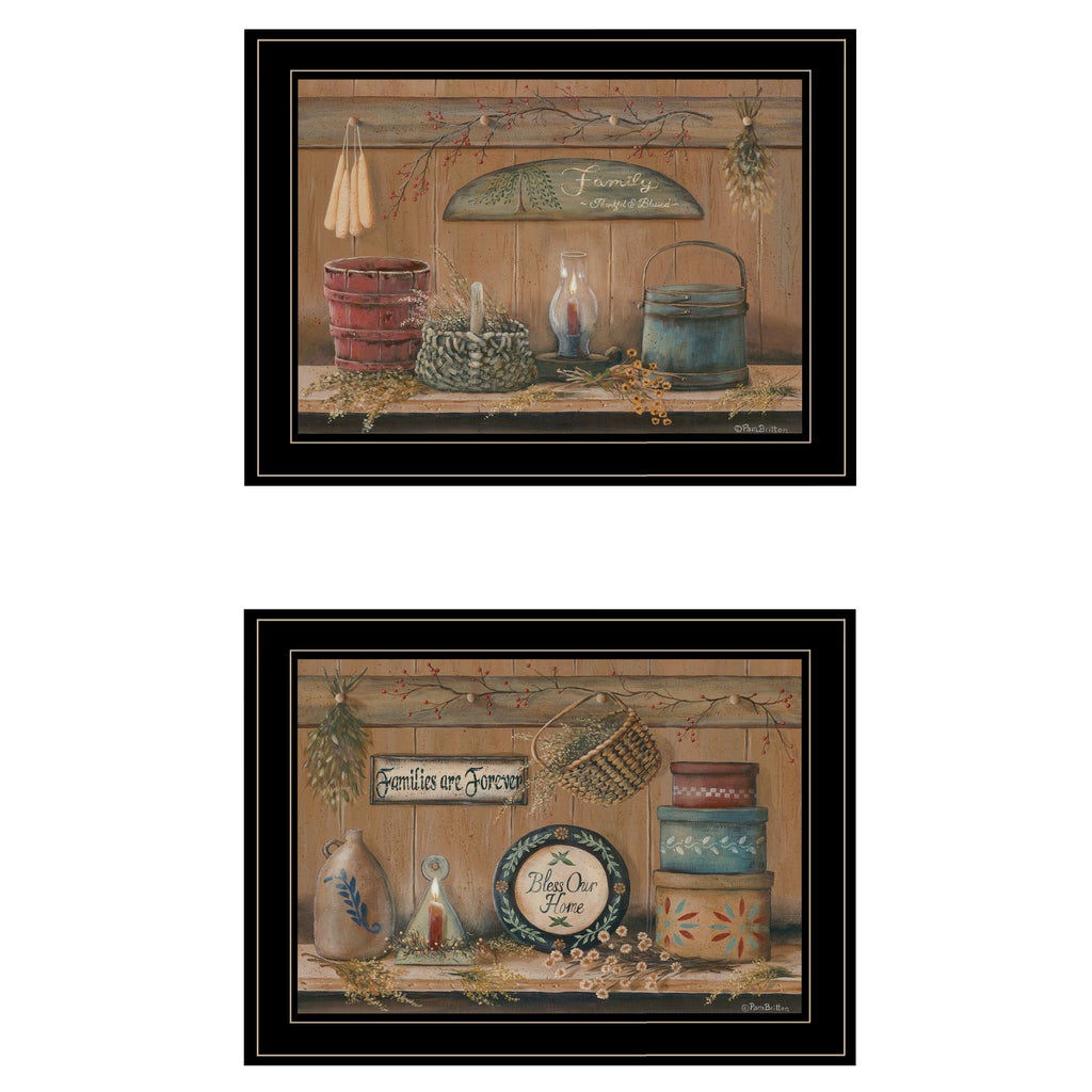 VBR695-704G "Shelf Treasures" by Artisan Pam Britton. This decorative black framed 2-pc(19x15) Collection of beautiful primitive treasures; stringed candles, baskets, hat boxes, crock , wooden bucket, glass lantern. Earth tone background to fit in any country home. This framed art is totally American made. The surface of the art is coated with a fade resistant texture which gives it a canvas-like appearance. No glass is necessary. Arrives ready to hang. •Women Owned (WBE)•Textured Artwork with a 'rolled on' acid free acrylic coating to create a canvas painting effect. No glass is necessary.•UV protectant coating protects artwork from fading.•Molding adds natural beauty to the framed art. Frame is keyholed for ease of hanging.•Frame is keyholed for ease of hanging.