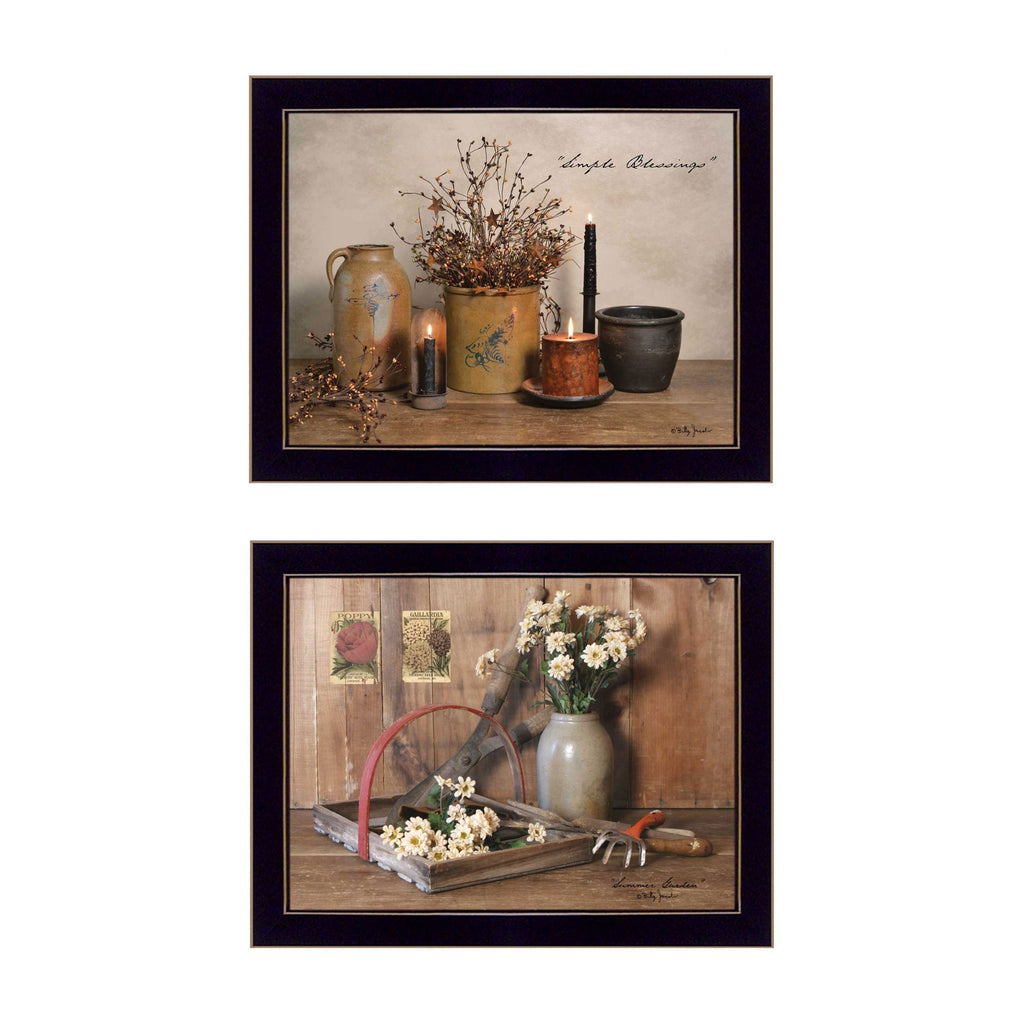 "Simple Blessings" is a set of (2) 18" x 14" framed framed art prints of the art of American artist, Billy Jacobs. This set includes 2 still life artworks with candles, crock pottery, bittersweet foliage and another framed print with garden related items, including garden tools, pottery, flowers and seed packets. The prints have an archival, protective finish (no glass is needed) and arrive ready to hang. Made in the USA by American workers.•Women Owned (WBE)•Textured Artwork with a 'rolled on' acid free acrylic coating to create a canvas painting effect. No glass is necessary.•UV protectant coating protects artwork from fading.•Arrives Ready to Hang