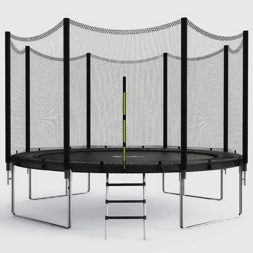 [Strong and Durable Structure]Our 14FT trampoline is made of galvanized stainless steel frame, which is weather and rust resistant, and equipped with 3-step ladder. All our trampolines feature reinforced T-sockets at each leg and enclosure joint, increasing frame stability. Sturdy U-shaped steel pipes under the trampoline well ensure stability. Visible sections are finished with a UV-resistant coating to protect your trampoline from the sun and premature material fading for a longer life.