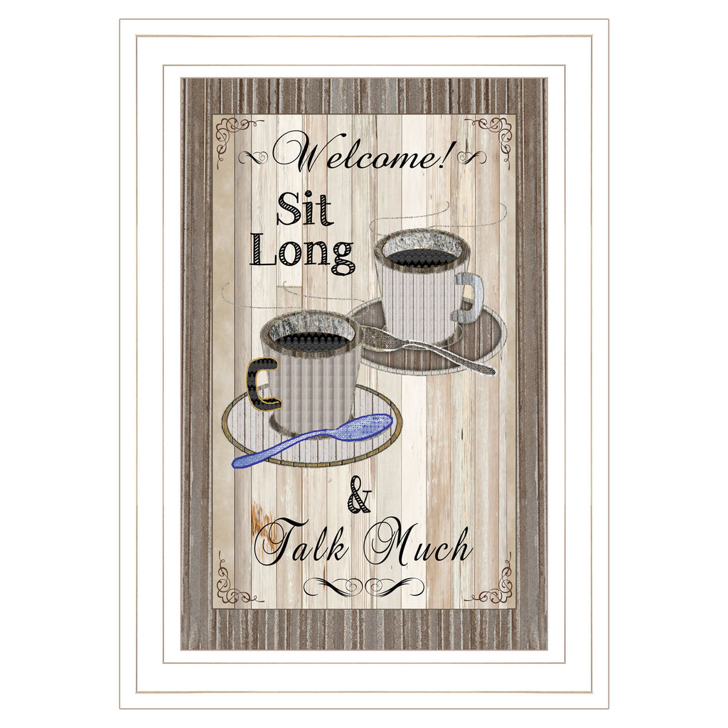 ME66AL-226G "Sit Long, Talk Much" vignette decorative white framed print(11x15)with cream background by artisan from Trendy Decor 4U. This print welcomes you to come in, sit a while; drink coffee, rest and relax. Print of a light cream background to match ME67AL-226G.The surface of the print is textured with a fade resistant coating so no glass is necessary. Arrives ready to hang. Made in the USA by skilled American workers. •Textured Artwork with a 'rolled on' acid free acrylic coating to create a canvas painting effect. No glass is necessary.•Surface of the print has a fade resistant coating.•Arrives Ready to Hang•Woman Owned Business (WBE)•Handmade in the USA•Decorative Moulding adds natural beauty to the framed art.