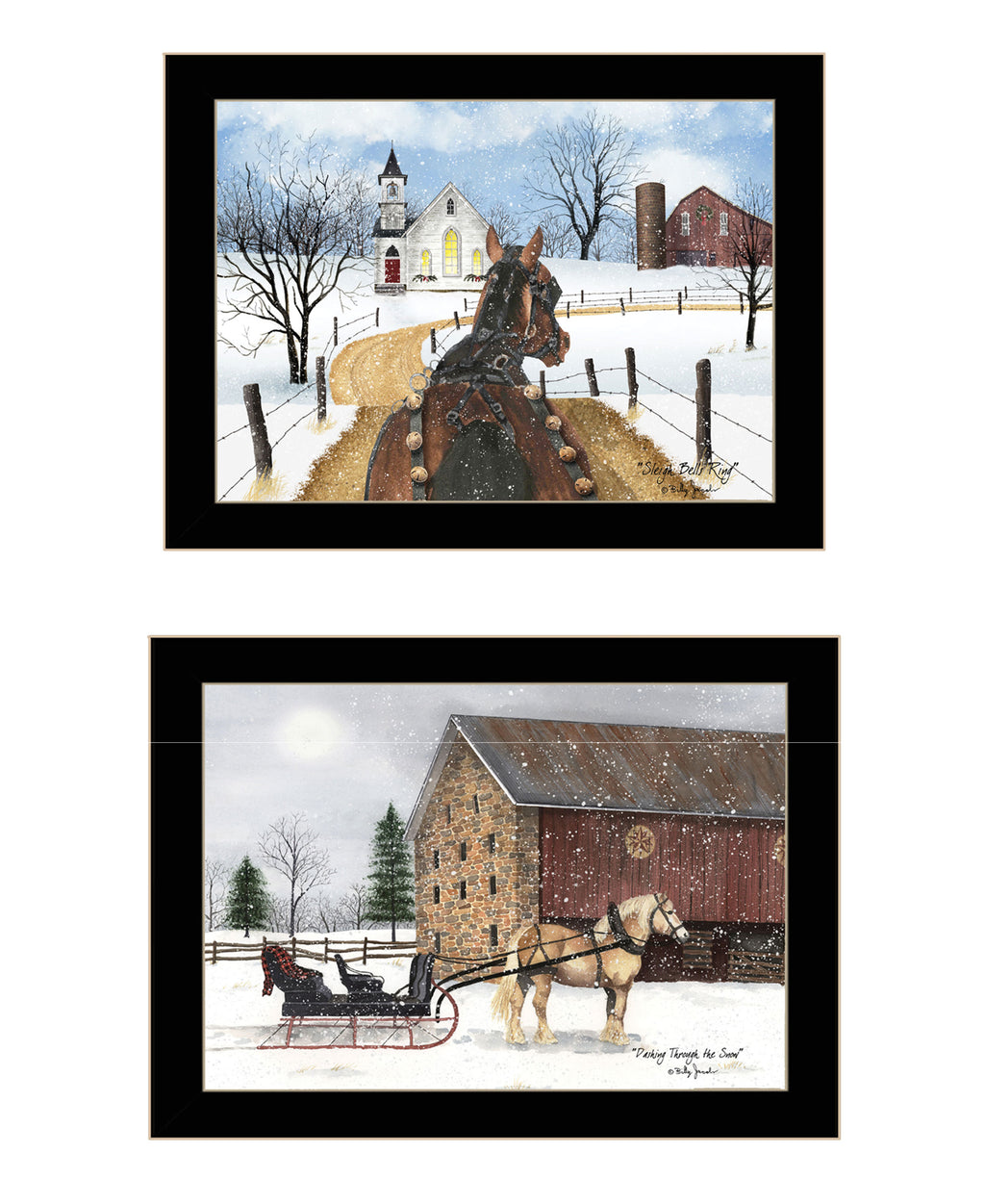 "Sleigh Bells Ringing" is by Artisan Billy Jacobs this two-piece vignette features two 18"x14" decoratively black framed wall art. Included in this vignette is "Dashing Through the Snow" this image depicts a snow-covered farm with a sleigh parked waiting for its passengers to embark on a snowy sleigh ride. The second image is "Sleigh Bells Ring" this image is a bird's eye view of a winter sleigh ride you can see the city coming into view as the snow continues to fall. These are perfect seasonal images. Our products are proudly made by skilled American workers. The surface of our framed art is textured with a fade resistant coating, so no glass is necessary. A vegetable-based glue is used in the production of our products, and our frames are crafted from 100% recycled material. In keeping with our environmentally friendly approach towards manufacturing. Arrives ready to hang•Print has fade resistant surface texture, no glass is necessary•Woman Owned Business (WBE)•Arrives ready to hang, no additional hardware needed on item•individually hand crafted by skilled American workers•Cleaning Instructions: Clean with Soft Dry Cloth Only•Made in U.S.A.•Artwork by American Artist
