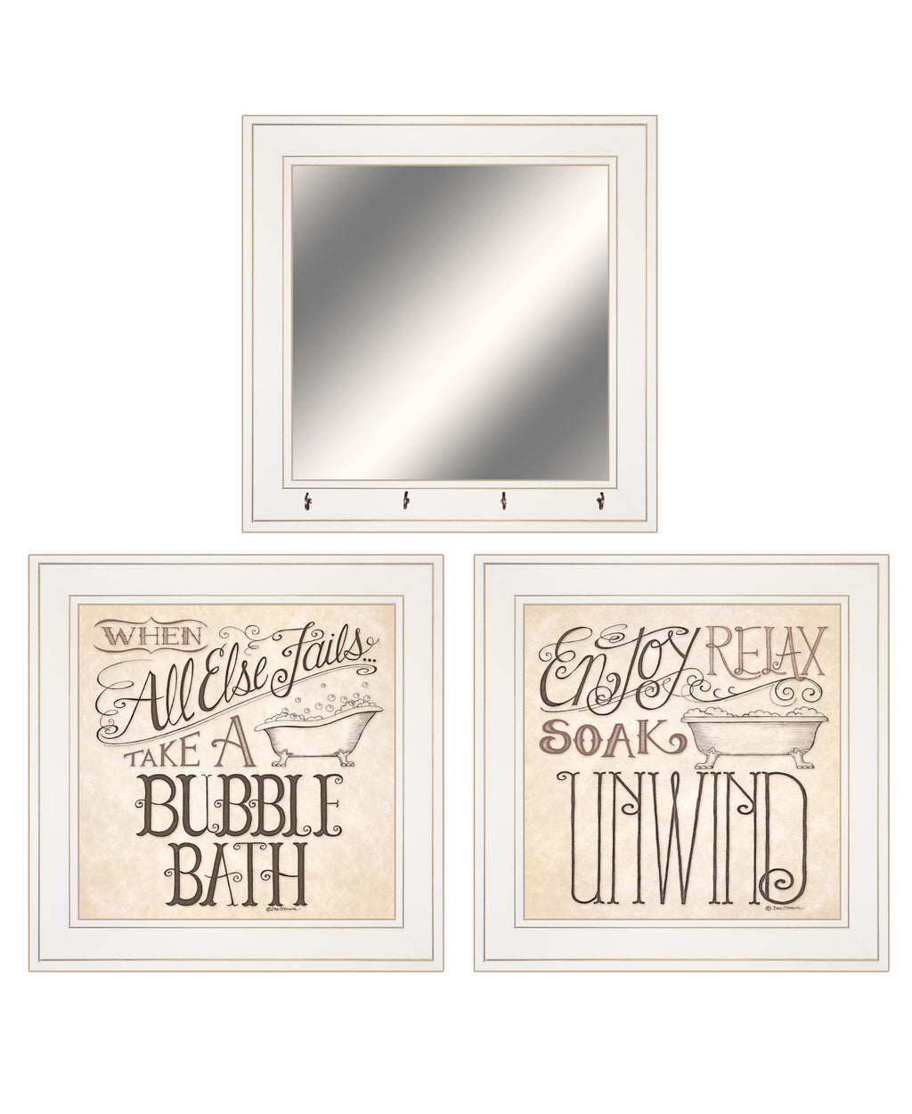 V464-226GMH "When All Else Fails" By Deb Strain. Three Piece Bathroom Collection features Handmade Decorative white (15x15) framed Mirror by Trendy Decor 4U. Includes 2 white framed prints: "When All Else Fails" (15x15) and "Soak & Unwind" (15x15). The surface of the art is coated with a fade resistant texture which gives it a canvas-like appearance. No glass is necessary. Arrives ready to hang. Made in USA.•Women Owned (WBE)•Textured Artwork with a 'rolled on' acid free acrylic coating to create a canvas painting effect. No glass is necessary.•UV protectant coating protects artwork from fading.•Molding adds natural beauty to the framed art. Frame is keyholed for ease of hanging.•Frame is keyholed for ease of hanging.
