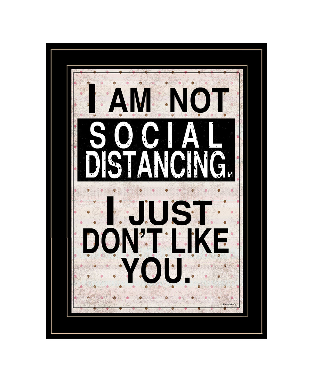 "Social Distancing" is by Artisan Ed Wargo. This 15"X19" decorative black framed wall art. The sign features the script reads "I am not social distancing I just don't like you.". Our products are proudly made by skilled American workers. The surface of our framed art is textured with a fade resistant coating, so no glass is necessary. A vegetable-based glue is used in the production of our products, and our frames are crafted from 100% recycled material. In keeping with our environmentally friendly approach towards manufacturing. Arrives ready to hang.•Print has fade resistant surface texture, no glass is necessary•Woman Owned Business (WBE)•Arrives ready to hang, no additional hardware needed on item•individually hand crafted by skilled American workers•Cleaning Instructions: Clean with Soft Dry Cloth Only•Made in U.S.A.•Artwork by American Artist