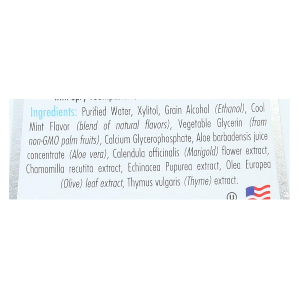 ingredients : purified water;xylitol;grain alcohol;ethanol;cool mint flavor;blend of natural flavors;vegetable glycerin;from non-gmo palm fruits;calcium glycerophosphate;aloe barbadensis juice concentrate;aloe vera;calendula officinalis;marigold;flower extract;chamomilla recutita extract;echinacea pupurea extract;oleo europea;olive;leaf extract;thymus vulgaris;thyme;extract