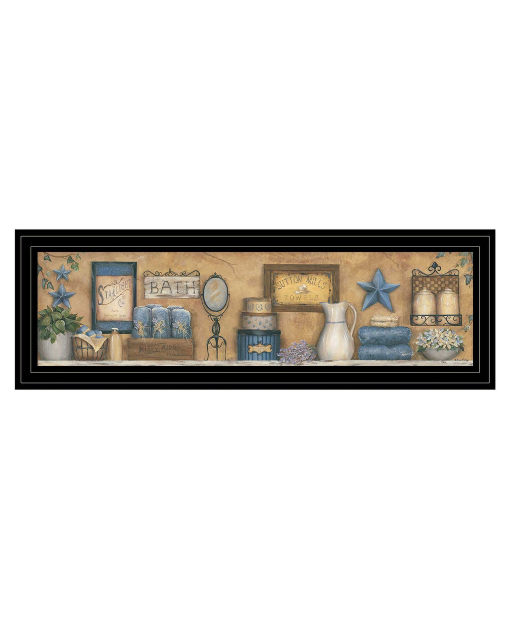 CAR168-704G - "Starlight Bath" by artisan Carrie Knoff. This 33x11 Black framed print of vintage bathroom items, flowers, and barn stars. Pops of Blue accent the muted colors of vintage ceramics, towels, and florals round out items for a country bathroom. This totally American Made wall decor item features an decorative black frame. The framed art print has a protective, archival finish (glass is not needed) and arrives ready to hang.•Textured Artwork with a 'rolled on' acid free acrylic coating to create a canvas painting effect. No glass is necessary.•Surface of the print has a fade resistant coating.•Arrives Ready to Hang•Woman Owned Business (WBE)•Handmade in the USA•Decorative Moulding adds natural beauty to the framed art.