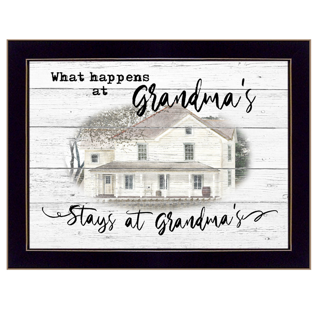 BJ1207-712 "Stays at Grandma's" by Artisan Billy Jacobs. This decorative black framed 1-pc(18x14) of farm life. What happens at Grandma's says at Grandma's again with the background of a farm house where kids build so many memories being with their grandparents. Framed print has a UV coating (glass is not needed) and arrives ready to hang. Made in USA. •Women Owned (WBE)•Textured Artwork with a 'rolled on' acid free acrylic coating to create a canvas painting effect. No glass is necessary.•UV protectant coating protects artwork from fading.•Molding adds natural beauty to the framed art. Frame is keyholed for ease of hanging.•Frame is keyholed for ease of hanging.