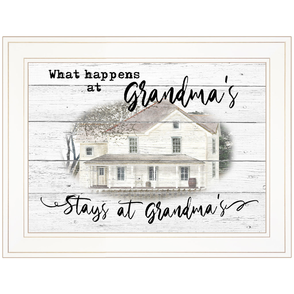 BJ1207-226G "Stays at Grandma's" by artisan Billy Jacobs, in a decorative grooved (19x15) white frame. This art features a homestead setting (Grandma's House) and has Script that says: What Happens at Grandma's -stays at Grandma's. This piece of artwork is done by the famous Ohio artisan Billy Jacobs. The surface of the print is textured with a fade resistant coating so no glass is necessary. Arrives ready to hang. Made in the USA by skilled American workers. •Textured Artwork with a 'rolled on' acid free acrylic coating to create a canvas painting effect. No glass is necessary.•Surface of the print has a fade resistant coating.•Arrives Ready to Hang•Woman Owned Business (WBE)•Handmade in the USA•Decorative Moulding adds natural beauty to the framed art.