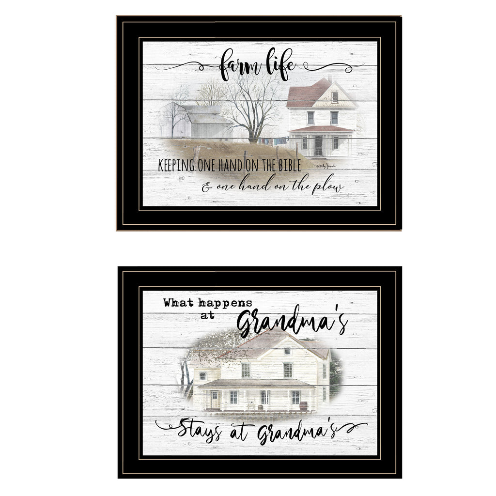 VBJ679-704G "Stays at Grandma's" by Artisan Billy Jacobs. This decorative black framed 2-pc(19x15) Collection of farm life. A farmstead background of house and barn; one print says "Keeping one hand on the bible & and the other on the plow". The second framed print says : "What happens at Grandma's says at Grandma's" again with the background of a farm house where kids build so many memories being with their grandparents. Framed print has a UV coating (glass is not needed) and arrives ready to hang. Made in USA. •Women Owned (WBE)•Textured Artwork with a 'rolled on' acid free acrylic coating to create a canvas painting effect. No glass is necessary.•UV protectant coating protects artwork from fading.•Molding adds natural beauty to the framed art. Frame is keyholed for ease of hanging.•Frame is keyholed for ease of hanging.