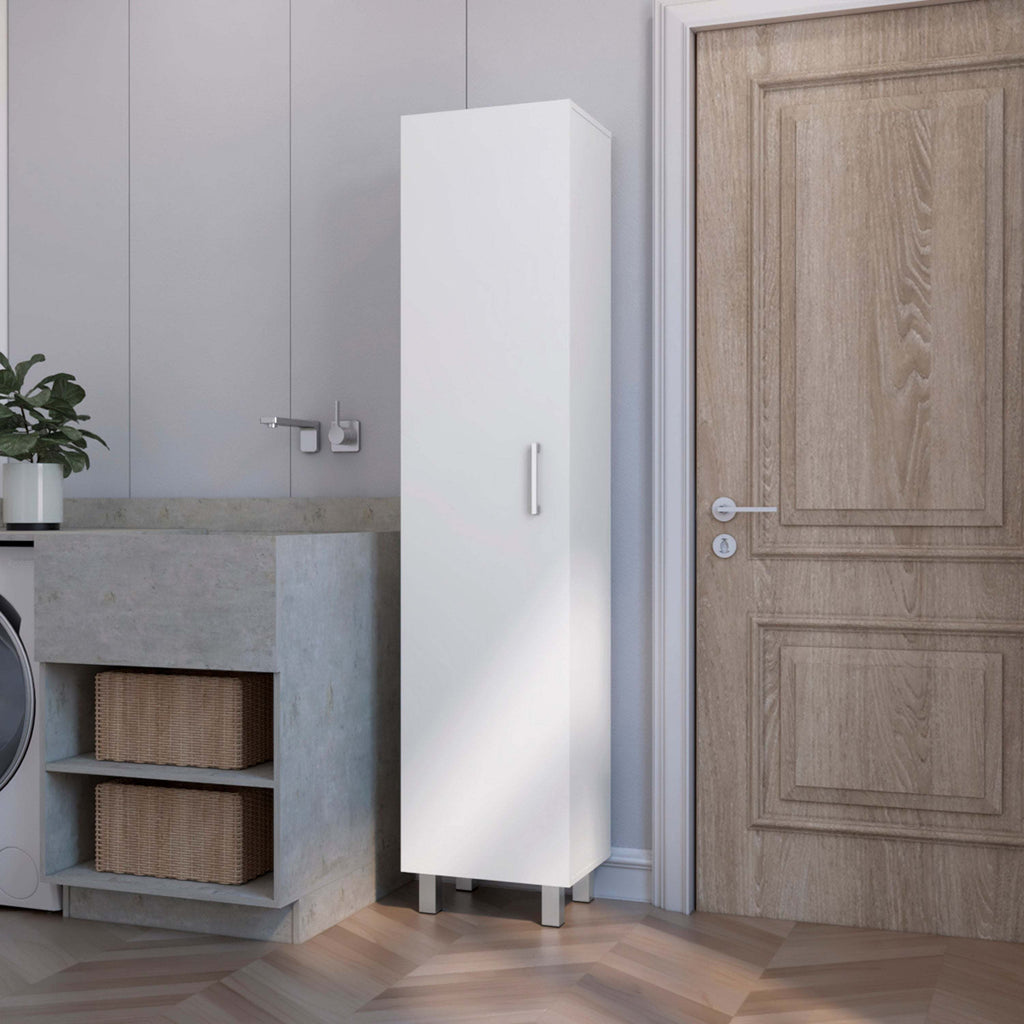 Do you have a cluttered home with no place to store your things? Look no further because the Stephan Tall Storage Cabinet is here to help! With its slim shape, it can easily be adapted to fit into any space in your home, and it comes with a long, wide door with broom hangers inside, perfect for organizing your brooms. Plus, it has four wide shelves inside that are perfect for storing all your toiletries in an orderly fashion. And to top it all off, its metal handle and legs match perfectly!