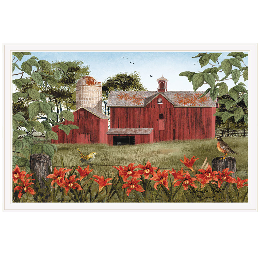 BJ1036ZGP-226G "Summer Days" a framed Giclee print by artist Billy Jacobs, in a stylish 38x26" white frame. This art features summer on the farm when green foliage is bountiful. Tiger Lilies are in bloom all along a barb wire fence in the foreground giving a comfortable place to perch for a robin and house wren. The largest of several red barns has a rusty metal roof complete with cupola, while a silo towers overhead. This framed art is totally American made. The surface of the art is coated with a fade resistant texture which gives it a canvas-like appearance. No glass is necessary. Arrives ready to hang. About "Giclee prints": With giclee's the inks are actually sprayed into place similar to an ink jet printer. Even under a magnifier there seems to be no dots! Giclee's also use specially made inks with true light fast pigments. This ensures that the artwork you purchase will retain its color. Independent laboratories have rated the inks to be fade resistant to 115 years. The giclee is basically the best available.•Print has fade resistant surface texture, no glass is necessary•Giclee print, highest quality print•Arrives ready to hang, no additional hardware needed on item•individually hand crafted by skilled American workers•frame mitered with precision equipment•Framed art with no glass for safety around children