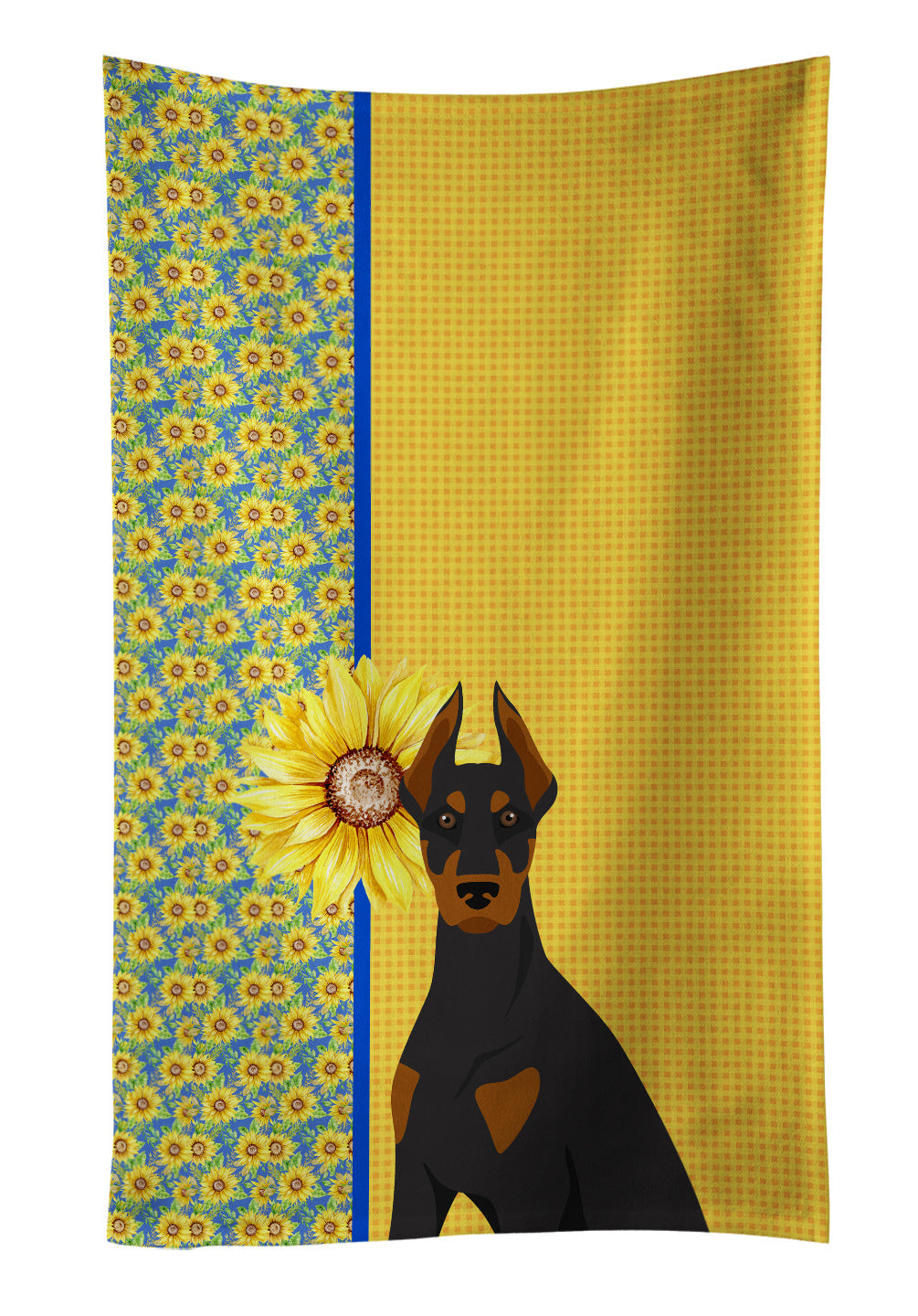 Kitchen Towel featuring breed specific Doberman Pinscher artwork. Add this colorful Kitchen Towel to decorate for Summer, This Kitchen Towel is from Caroline's Treasures collection Summer Sunflowers. Experience the perfect blend of aesthetic appeal and functional excellence with our Plush Velour Kitchen Towels. These are not your ordinary decorative kitchen towels that gather dust. Instead, they are designed to be as practical as they are stylish. The front layer of our towel is constructed from a minky plush polyester, known for its durability and color retention. Unlike conventional kitchen towels, the artwork on our towels is dyed directly into the fabric, ensuring vibrant colors that last. Polish your glassware to a brilliant sparkle using the plush front side of the towel. Flip to the back, crafted from 100% cotton terry loop, to exploit its exceptional absorbency for drying dishes or wiping down counters. Our kitchen towels redefine the concept of functional art, offering lasting quality that maintains the towel's shape over time. Measuring 15 inches by 25 inches and weighing 2.3 lbs per dozen, these towels deliver an overwhelming sensory experience with their soft, plush, and smooth texture. The edges are meticulously finished with binding, enhancing their durability and visual appeal. For your convenience, these towels are machine washable and can be dried on low heat. After the first wash, the top fabric becomes even softer and fluffier, eliminating the need for ironing. Treat your kitchen to the luxury and functionality it deserves with our plush velour kitchen towels. This Kitchen Towel is from Caroline's Treasures Dogs category of products.