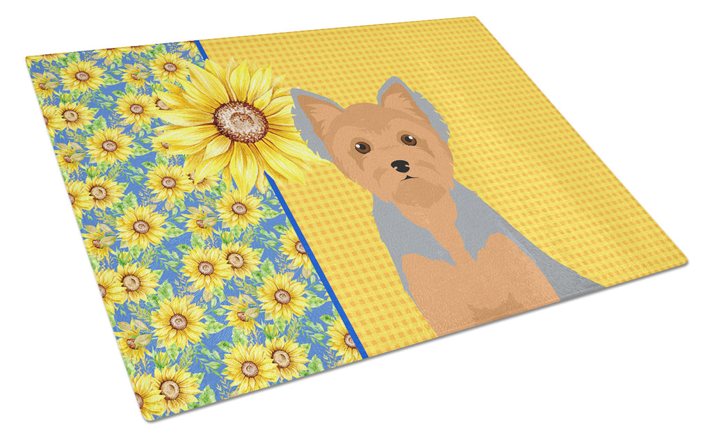 Glass Cutting Board featuring breed specific Yorkshire Terrier artwork. Add this colorful Cutting Board to decorate for Summer, This Glass Cutting Board is from Caroline's Treasures collection Summer Sunflowers. Introduce your kitchen to the vibrant, large Decorative Glass Cutting Board from Caroline's Treasures. Crafted from resilient tempered glass, this board is not only a utilitarian necessity but also a colorful art piece. With its generous dimensions of 15 inches in height and 12 inches in length, it offers ample space for all your cutting needs. Every piece showcases captivating artwork from distinguished artists, bringing an aesthetic edge to your kitchen. Beyond its attractive design, this cutting board ensures your countertop stays pristine and unscathed, owing to its heat-resistant properties. Engineered with user convenience in mind, it features non-skid feet for stability, and rounded corners for additional safety. Its robust construction renders it virtually unbreakable, guaranteeing longevity. The board comes with protective feet bumpers, maintaining its position during use. This product is recommended to be hand washed only. Proudly printed and assembled in the United States, this cutting board exemplifies superior craftsmanship. With Caroline's Treasures' Decorative Glass Cutting Board, you're investing in a blend of functionality and artistic flair. This Cutting Board is from Caroline's Treasures Dogs category of products.
